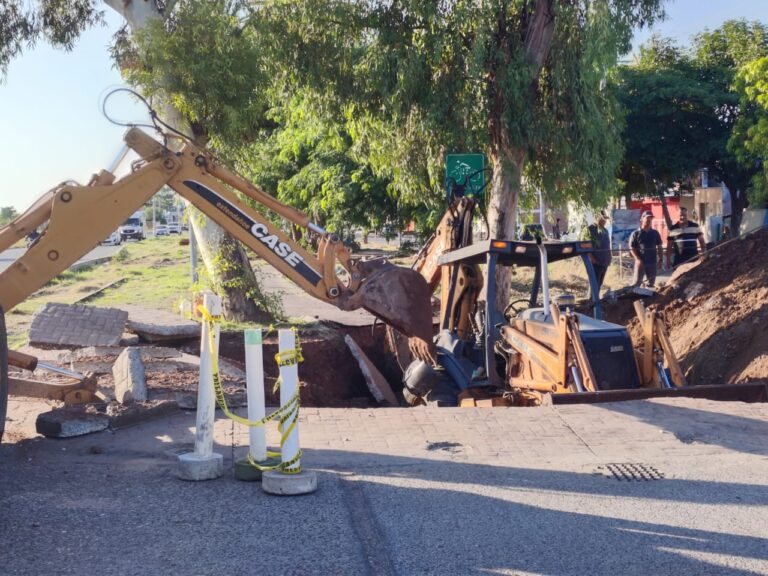 Los Mochis, Sin. – Una trascabo cayó sobre un nuevo socavón generado este jueves por la tarde en el cruce bulevar Centenario y Belisario Domínguez,