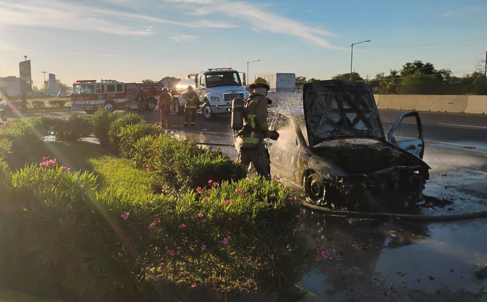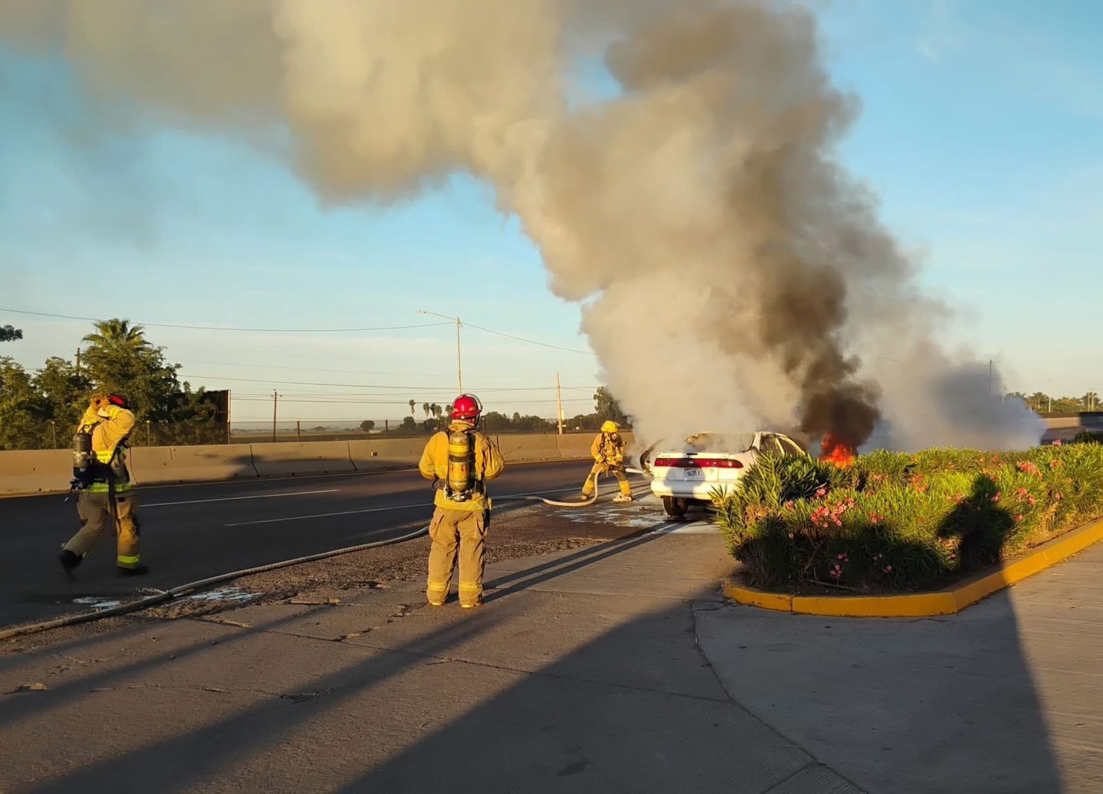Al arribar, los agentes localizaron un vehículo tipo sedán, marca Nissan, línea Sentra, modelo 1999, color blanco y sin placas de circulación, el cual se encontraba incendiándose por completo. Ante la magnitud del siniestro, se solicitó el apoyo del H. Cuerpo de Bomberos, para que se encargaran de controlar y sofocar las llamas.