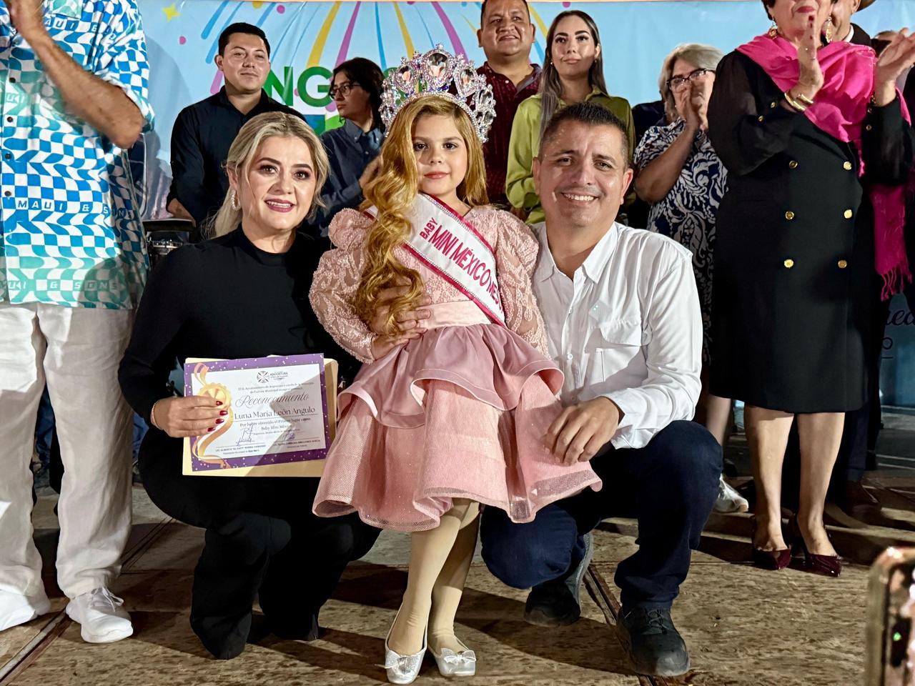 En el marco de la celebración, el presidente municipal y la señora Anita Gutiérrez realizaron la entrega de un reconocimiento especial a Ana María León Angulo, orgullosa angosturense y portadora del título Beby Mini México 2025, destacando su talento, disciplina y el orgullo que representa para el municipio.