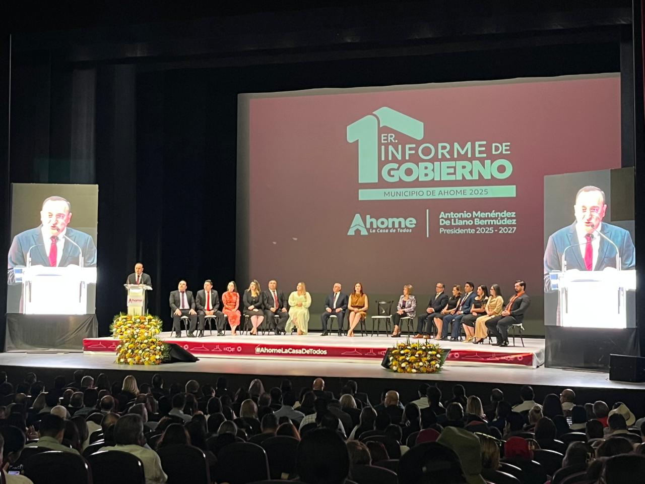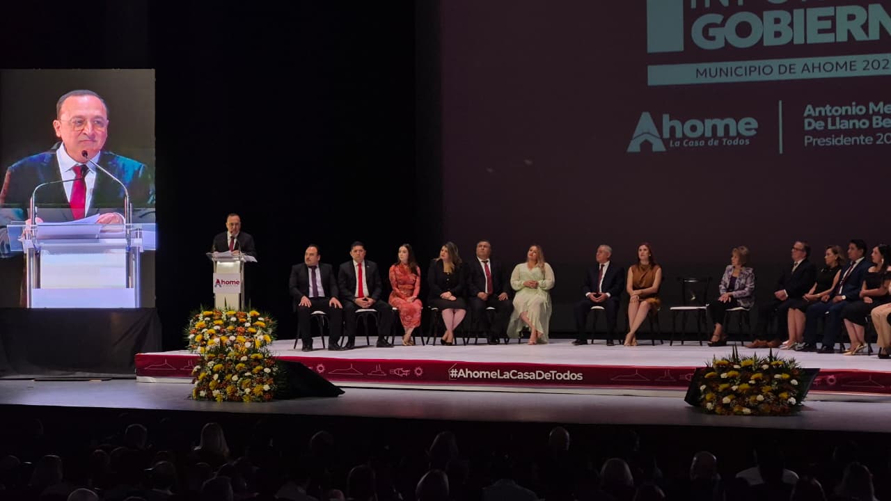 Los Mochis, Sin.- El alcalde de Ahome, Antonio Menéndez de Llano Bermúdez, rindió su primer Informe de Gobierno a la sociedad ahomense en el evento realizado este martes 28 de octubre en el Teatro Ingenio.