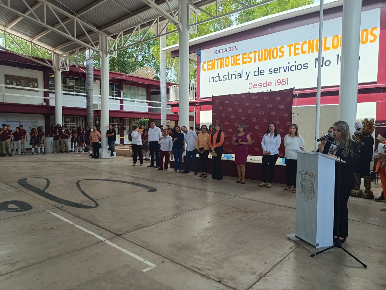 Guasave, Sin.- En la inauguración del ciclo escolar 2024-2025 en el CETIS 108, la directora general de Educación, Angélica María Rábago Espinoza, informó que se apoyó a este plantel con la construcción de una barda perimetral y también con la donación de 200 butacas que se retiraron del auditorio Héroes de Sinaloa, que ya fueron aprovechadas para renovar el auditorio de esta escuela.