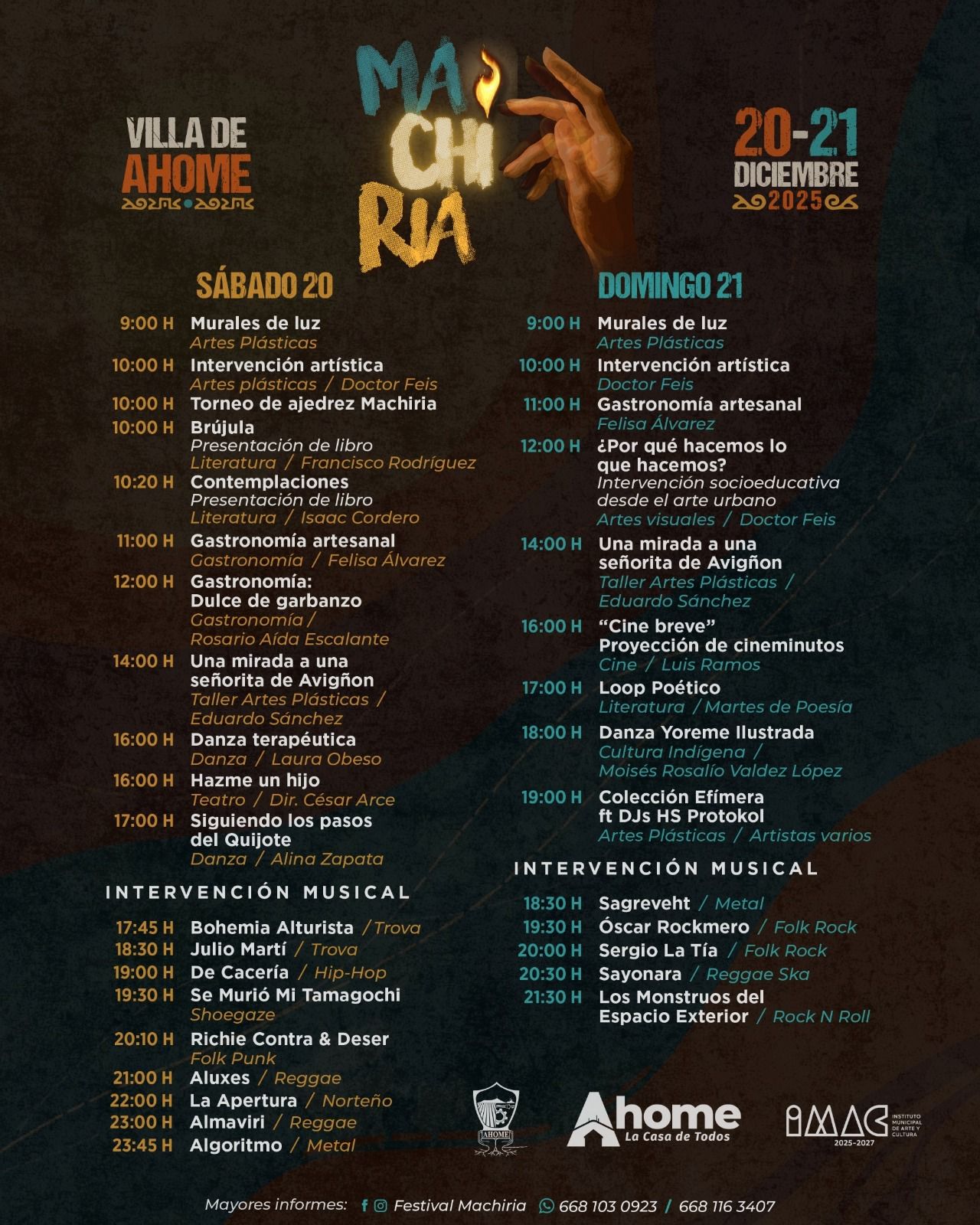 ‘’El Festival Cultura Machiria celebra su edición número 12 y con ello se fortalece como el proyecto cultural comunitario más importante de la Villa de Ahome, un pueblo señorial con profunda historia, identidad y tradición, desde su nacimiento en 2013, Machiria surgió como una respuesta ciudadana para crear espacios donde el arte, la cultura y la convivencia fueran una alternativa frente a la violencia y la falta de oportunidades para niños, niñas y jóvenes’’.