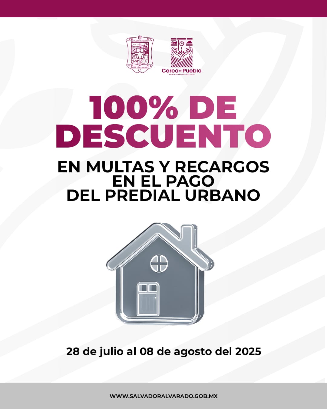 Guamúchil, Sin.- El Ayuntamiento de Salvador Alvarado anunció un nuevo periodo de descuentos en el pago del impuesto predial urbano. Del 28 de julio al 8 de agosto, la Tesorería Municipal aplicará el 100% de descuento en multas y recargos, con el objetivo de que más ciudadanos puedan ponerse al día.