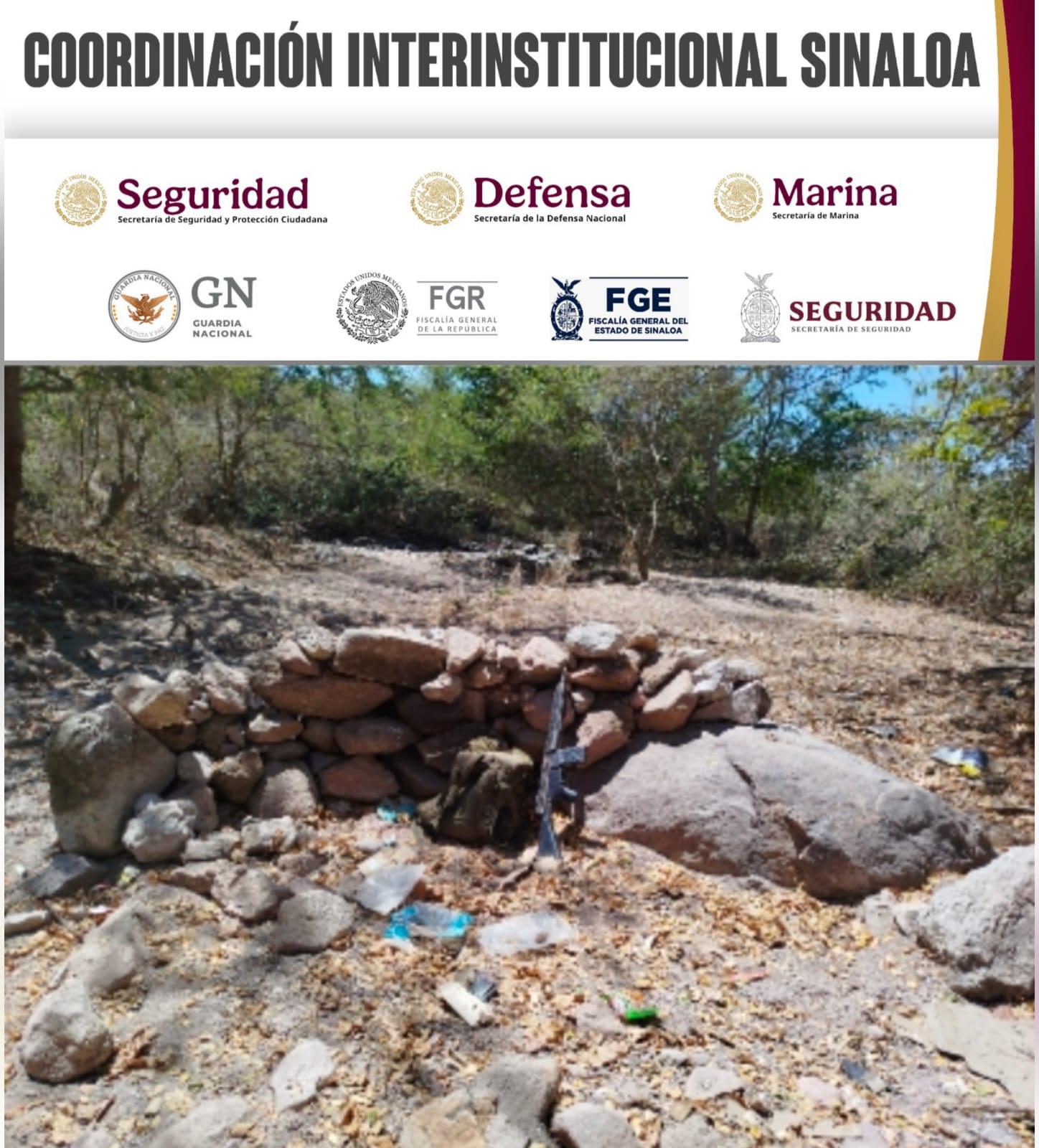 Escuinapa, Sin.- Como resultado de trabajos coordinados del Grupo Interinstitucional, autoridades de los tres órdenes de gobierno aseguraron un campamento presuntamente utilizado por integrantes de la delincuencia organizada, así como armamento y municiones en el municipio de Escuinapa.