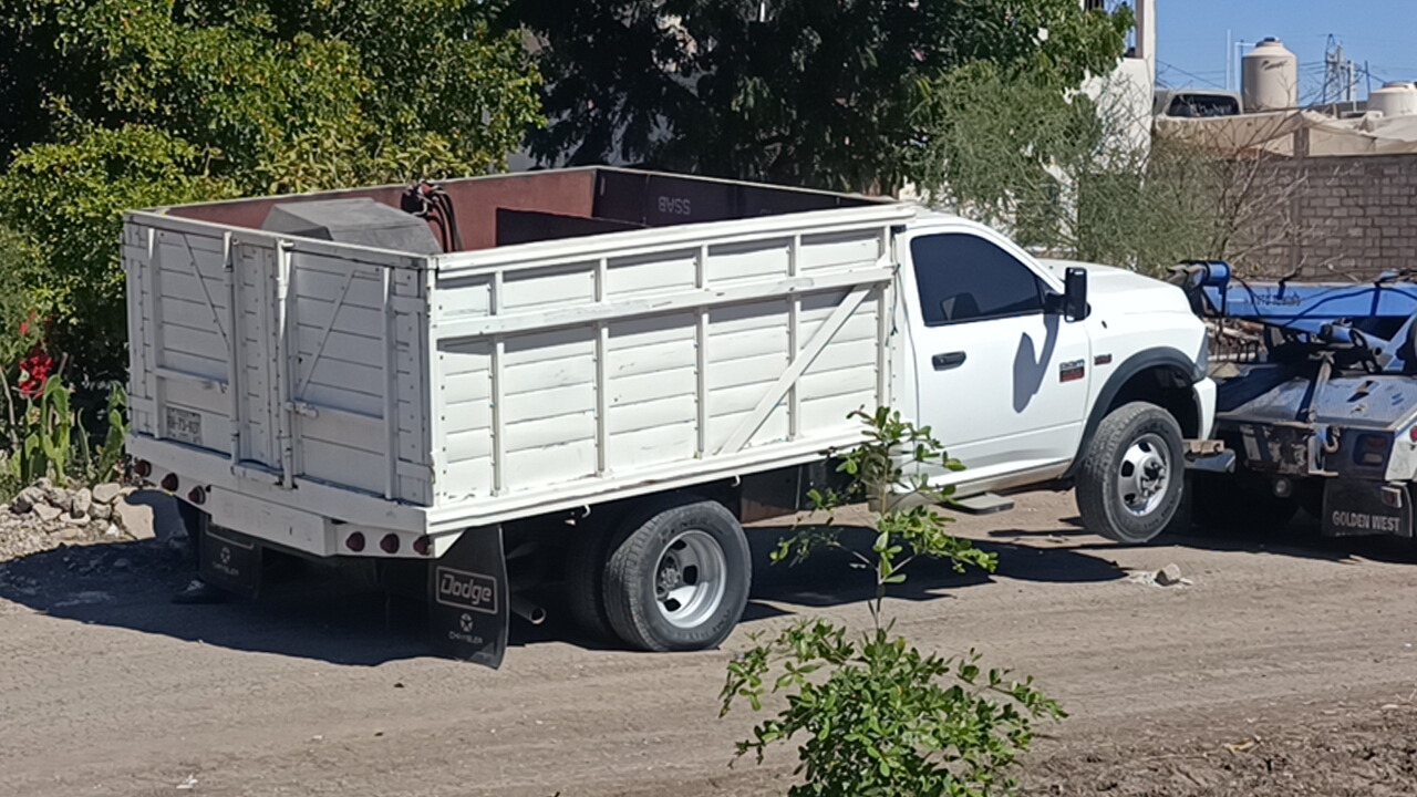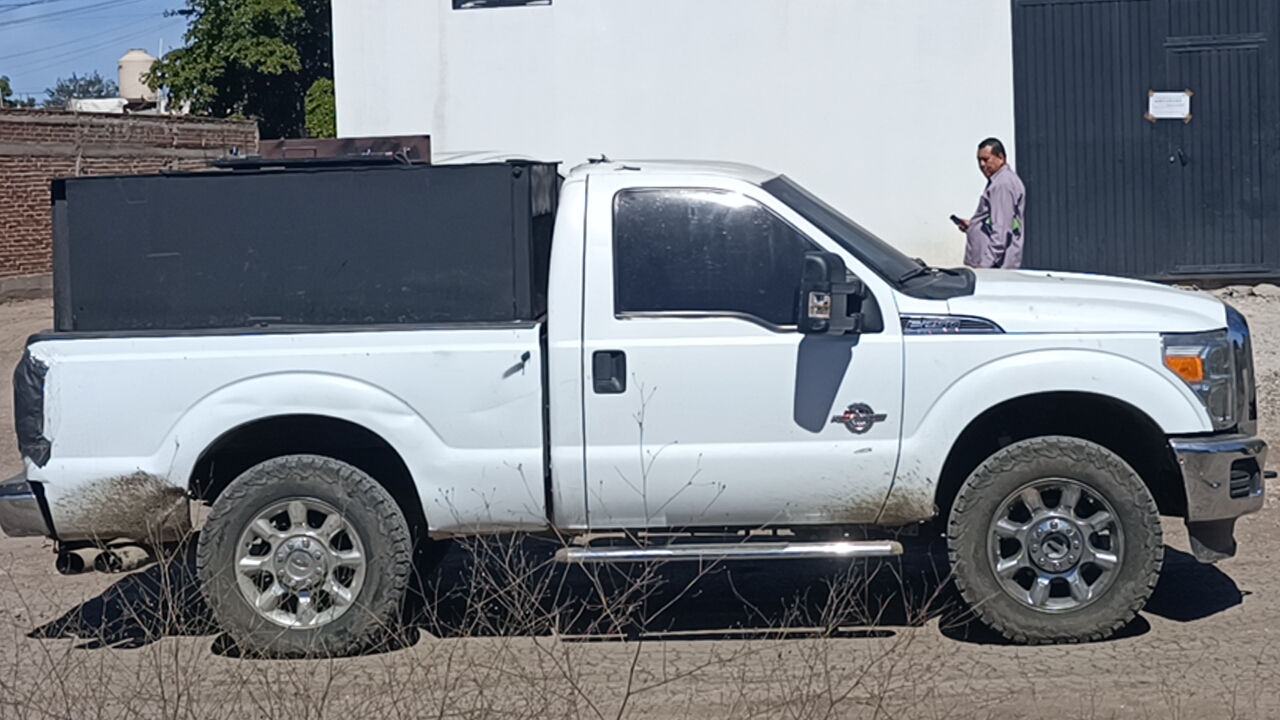 Las unidades son una Ram doble rodado de redilas, modelo resiente, con placas de circulación de Nuevo León, con blindaje artesanal y en su caja una burbuja con aditamentos para empotrar armas de grueso calibre y una Ford, Super Duty, sin placas de circulación, también color blanco con una caja metálica en la batea.