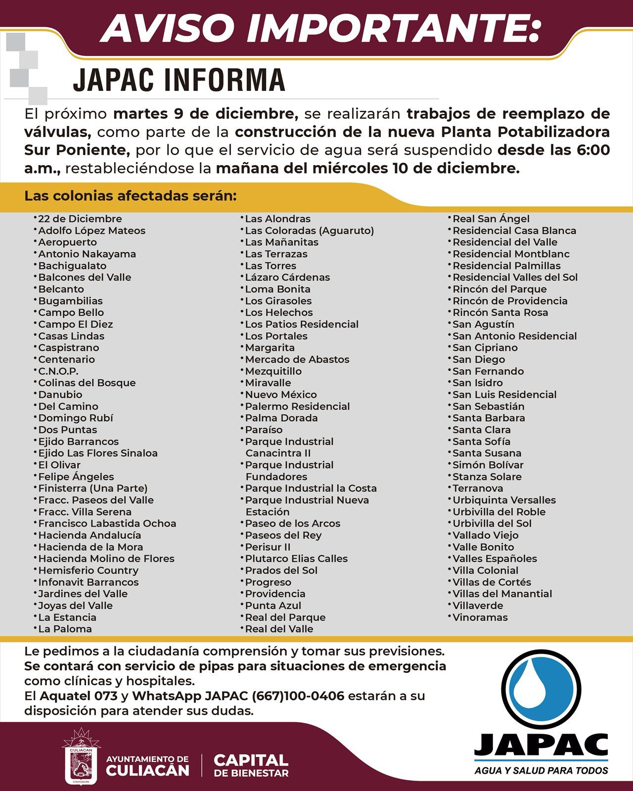 Culiacán, Sin.- JAPAC informó que como parte de los trabajos de construcción de la nueva Planta Potabilizadora Sur Poniente, se estarán llevando a cabo labores de reemplazo de válvulas, el próximo martes 9 de diciembre.