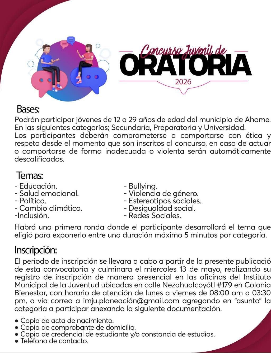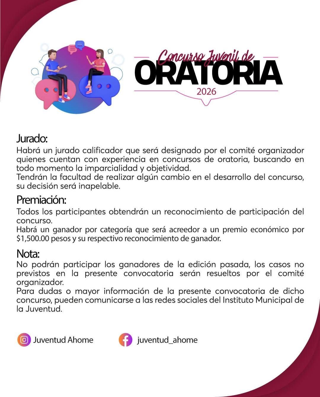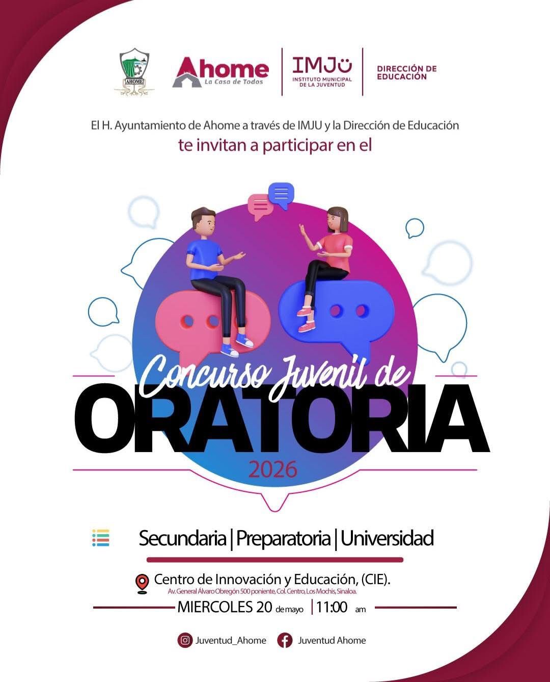 Para más información, pueden visitar las redes sociales de IMJU Ahome y checar las bases de este concurso que busca fomentar la participación juvenil y el análisis de problemáticas actuales del municipio de Ahome.