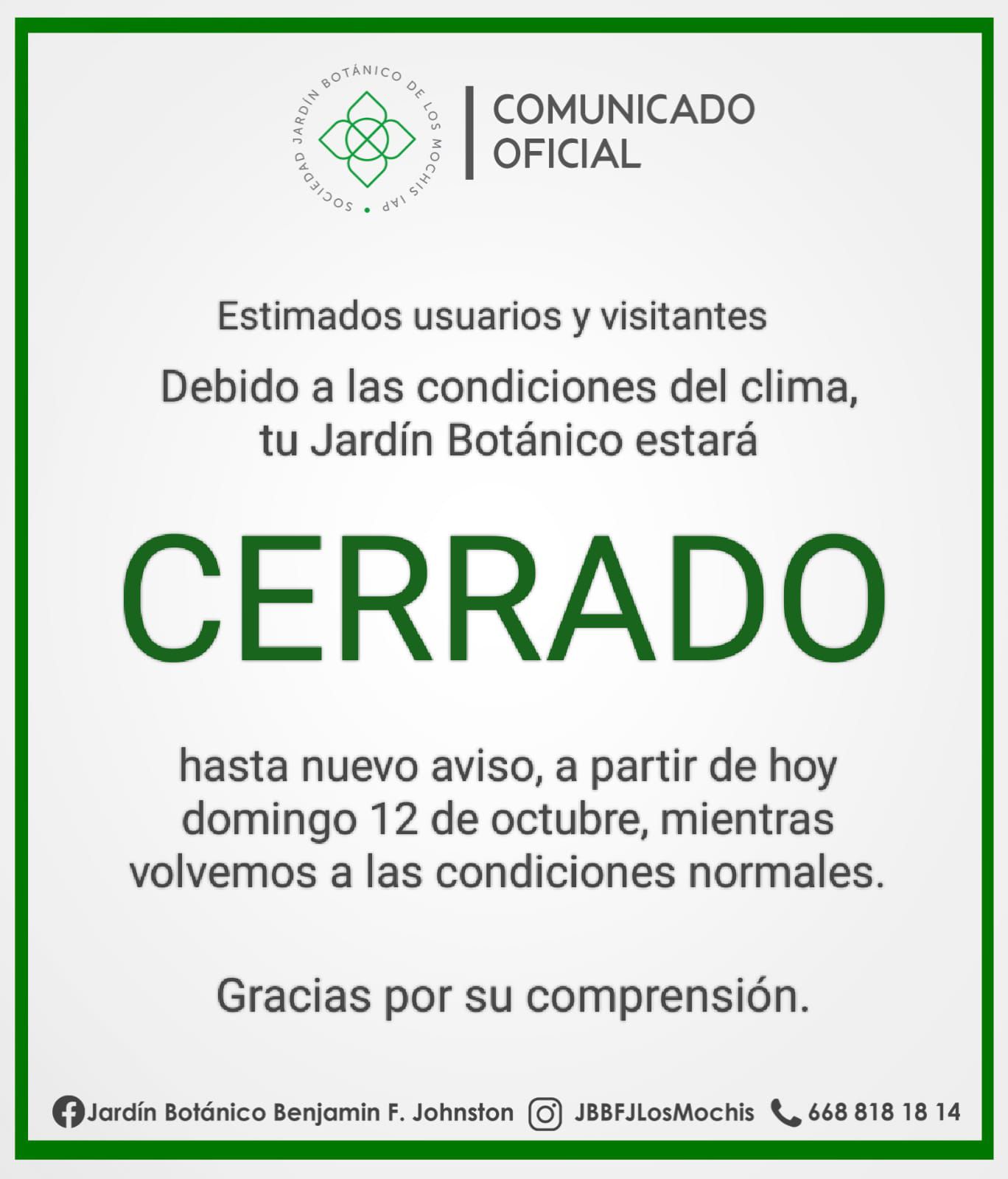“Que el día de hoy domingo 12 de octubre vamos a cerrar las puertas del Parque Sinaloa y su jardín botánico, esto debido a las condiciones del clima que estamos teniendo, vamos a estar a la espera de cómo avanza esta contingencia para poder anunciar pronto el próximo día de apertura”.