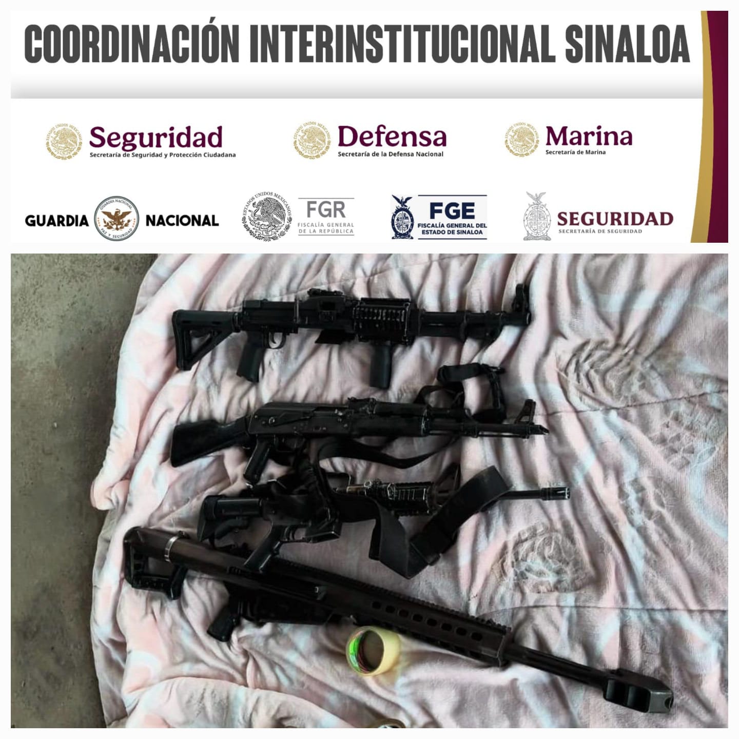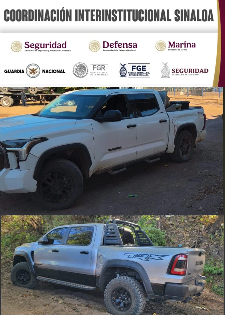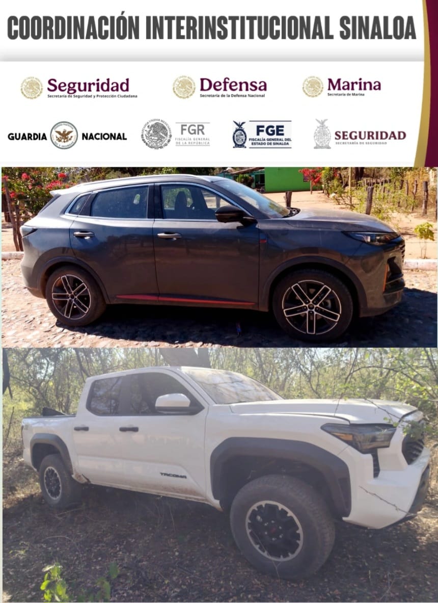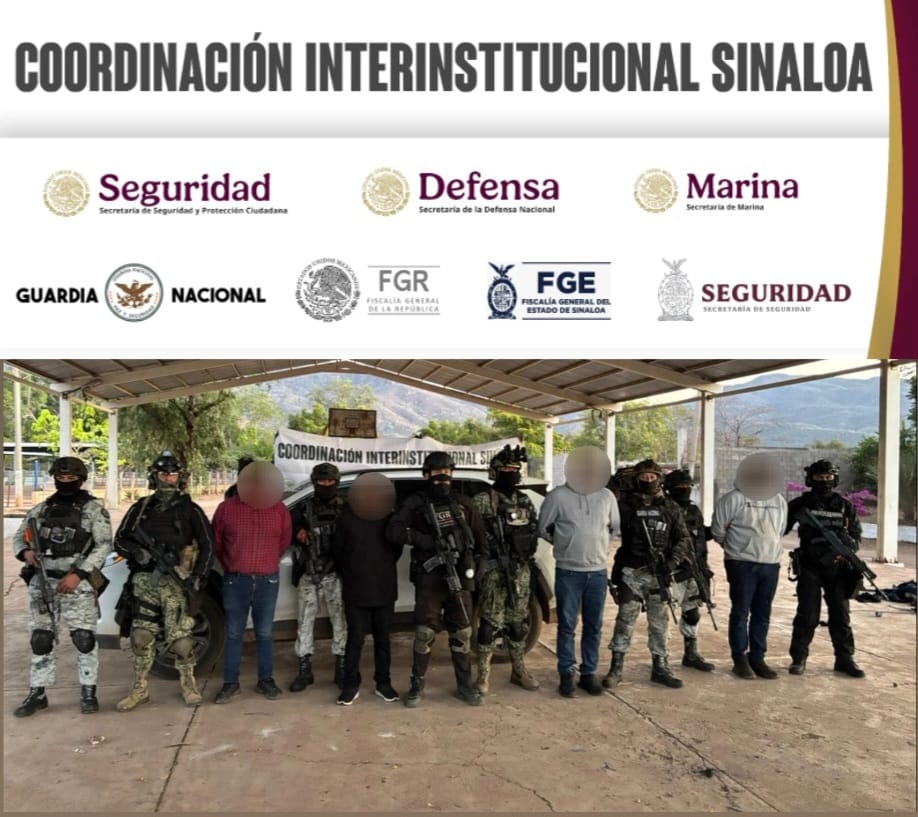 Culiacán, Sin.- Elementos del Ejército Mexicano, de la Guardia Nacional, de la Agencia de Investigación Criminal y de la Secretaría de Seguridad Pública del Estado, a través de la Policía Estatal Preventiva, en coordinación con la Secretaría de Marina, la Secretaría de Seguridad y Protección Ciudadana, la Fiscalía General de la República y la Fiscalía General del Estado, detuvieron a ocho civiles y aseguraron armas largas, cargadores, cartuchos y seis vehículos reportados como robados en operativos en el municipio de Badiraguato.