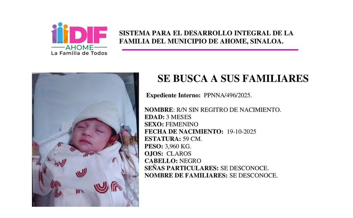 Los Mochis, Sin.- A través de un comunicado oficial, la Procuraduría de Protección de Niñas, Niños y Adolescentes del Sistema DIF Ahome solicita el apoyo de la ciudadanía para localizar a los familiares de una bebé de 3 meses, quien se encuentra bajo resguardo tras ser declarada en estado de abandono en el Hospital General de Los Mochis.