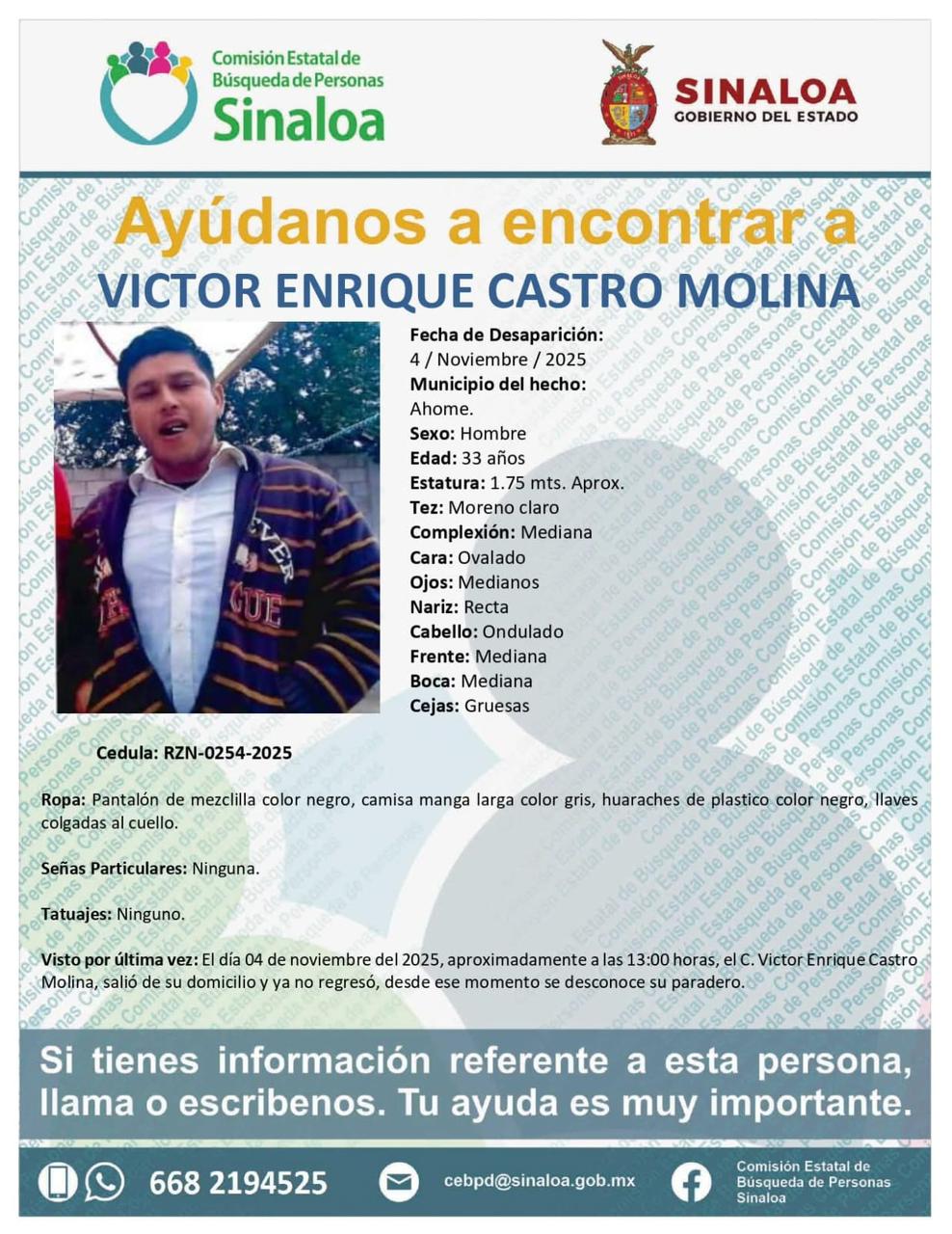 Culiacán, Sin. — La Comisión Estatal de Búsqueda de Personas de Sinaloa activó una ficha de búsqueda para localizar a Víctor Enrique Castro Molina, de 33 años de edad, quien desapareció el pasado 4 de noviembre en el municipio de Ahome. Desde entonces, no se tiene información sobre su paradero.