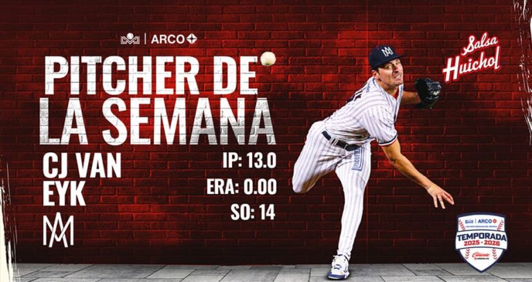 Guadalajara, Jal.- Dos tremendas salidas con los Águilas de Mexicali, hicieron que el serpentinero CJ Van Eyk se llevara el reconocimiento a Pitcher de la Semana, presentado por Salsa Huichol.