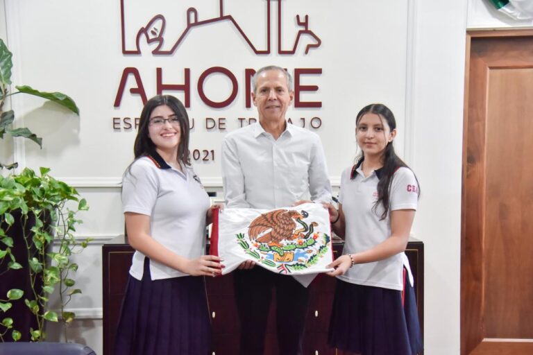 Los Mochis, Sin.- Las jóvenes Sofía Villasana López y Yolieth Urías Ruiz, estudiantes de preparatoria en el Colegio Enrique Arreguín, se reunieron con el Presidente