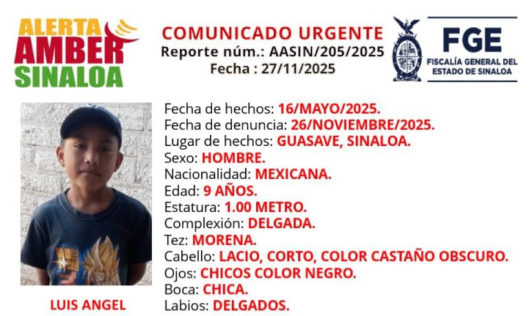Guasave, Sin.– La Fiscalía General del Estado emitió este jueves 26 de noviembre una Alerta Amber para la ubicación del menor Luis Ángel N, de