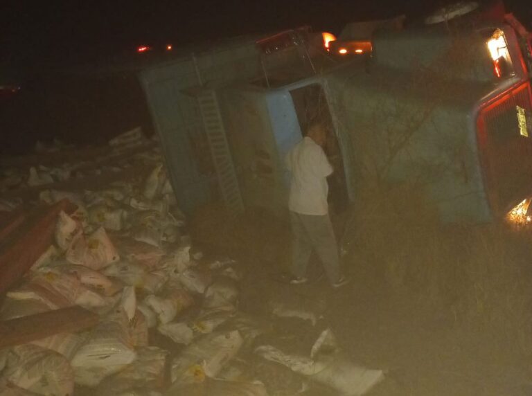 Guasave, Sin.- La noche de este miércoles, un camión tipo torton cargado con fertilizantes sufrió una salida de camino y volcadura sobre la carretera Internacional