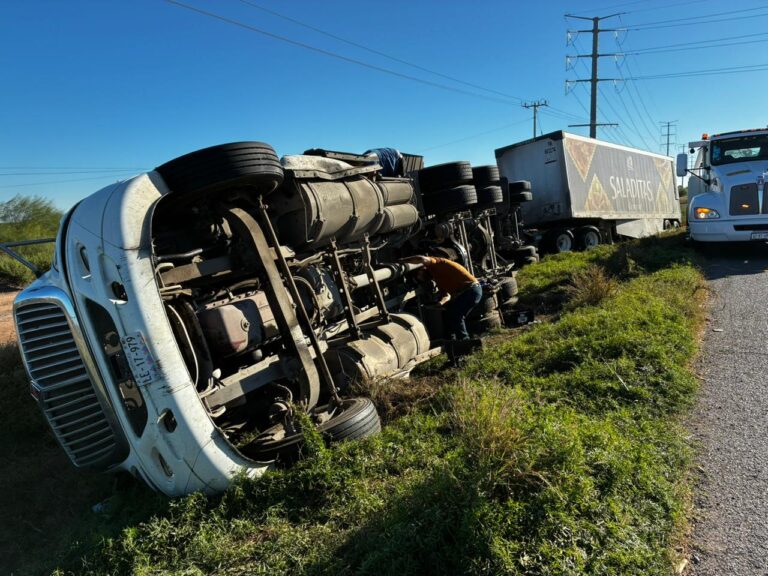 Los Mochis, Sin.- Un tráiler con doble semirremolque, propiedad de la empresa Gamesa, volcó esta madrugada mientras circulaba sobre la carretera internacional México 15, en el