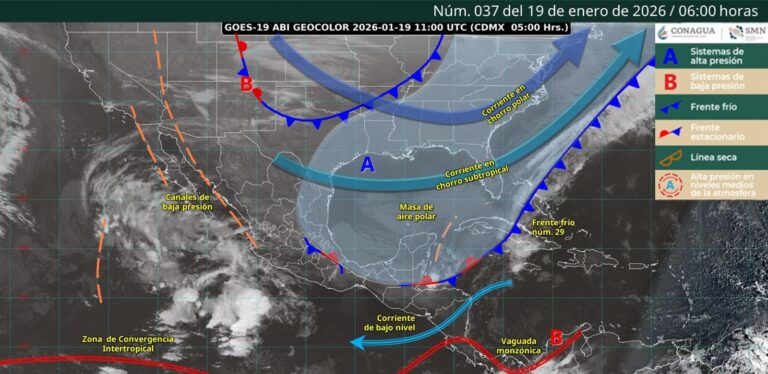 Ciudad de México.- Este día, el frente frío núm. 29 se desplazará sobre el mar Caribe, sin afectar a la República Mexicana, sin embargo, su