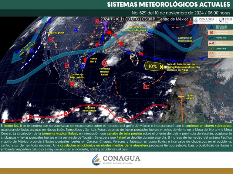 Ciudad de México.- El pronóstico del clima para México este domingo 10 de noviembre de 2024, anticipa condiciones de lluvias y vientos en distintas regiones