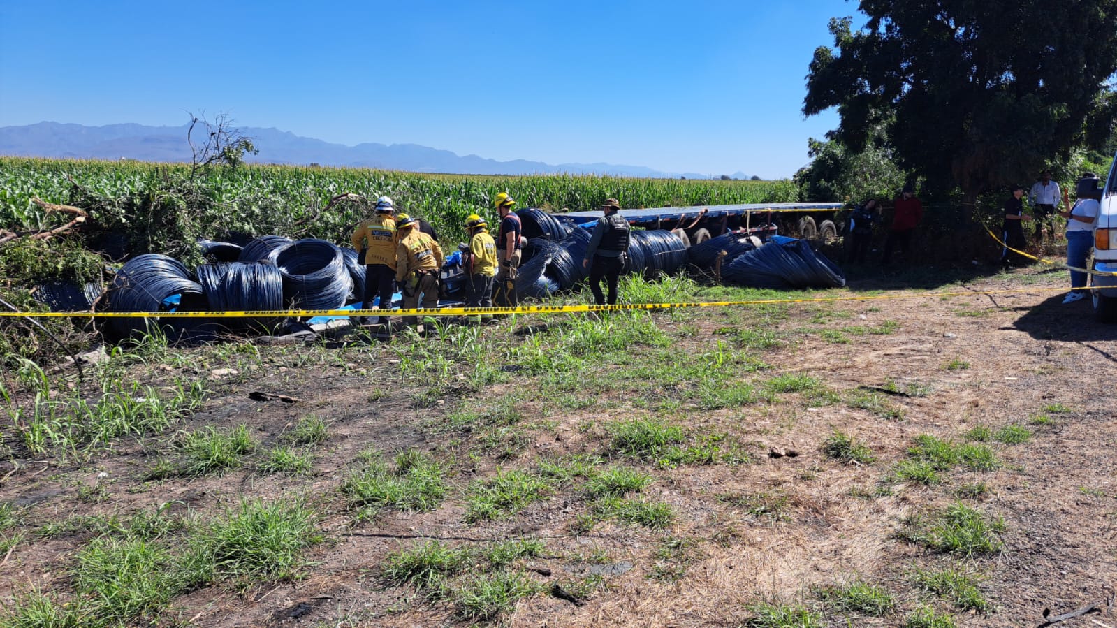 El conductor viajaba en un tráiler azul con plataforma cargado con rollos de alambrón de acero. Por razones aún desconocidas, perdió el control del volante y salió de la cinta asfáltica. En las maniobras, los amarres cedieron y los rollos se desprendieron, rodando con fuerza hasta caer sobre la cabina, donde el chofer quedó atrapado sin posibilidad de sobrevivir.
