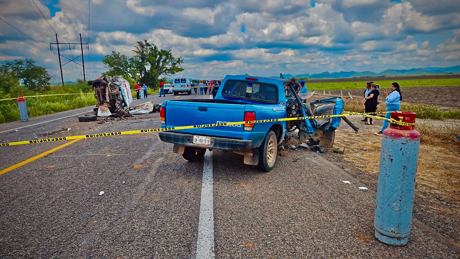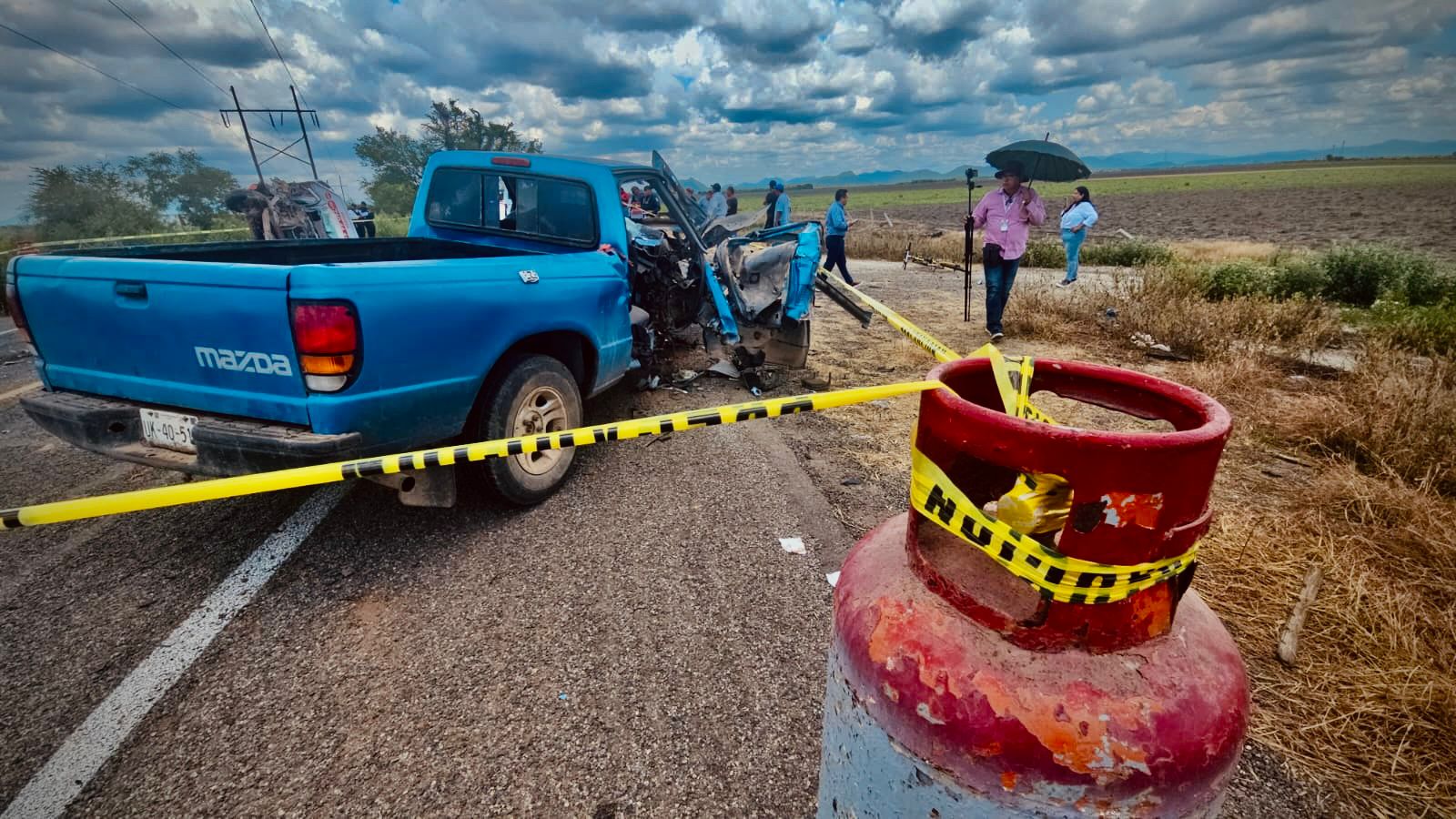 Culiacán, Sin.- Un fuerte choque entre dos camionetas ocurrido esta mañana sobre la carretera internacional México-15 libre, a la altura del kilómetro 38, dejó una persona muerta y dos más heridas. El accidente involucró una camioneta Mazda tipo pickup, color azul rey, y una Nissan NP300 con plataforma de cilindros de gas perteneciente a la empresa Tomza.