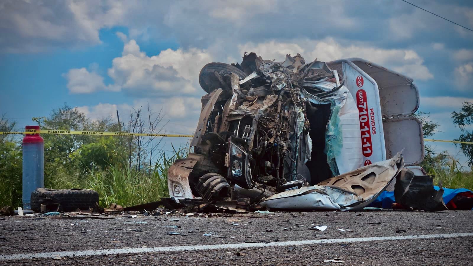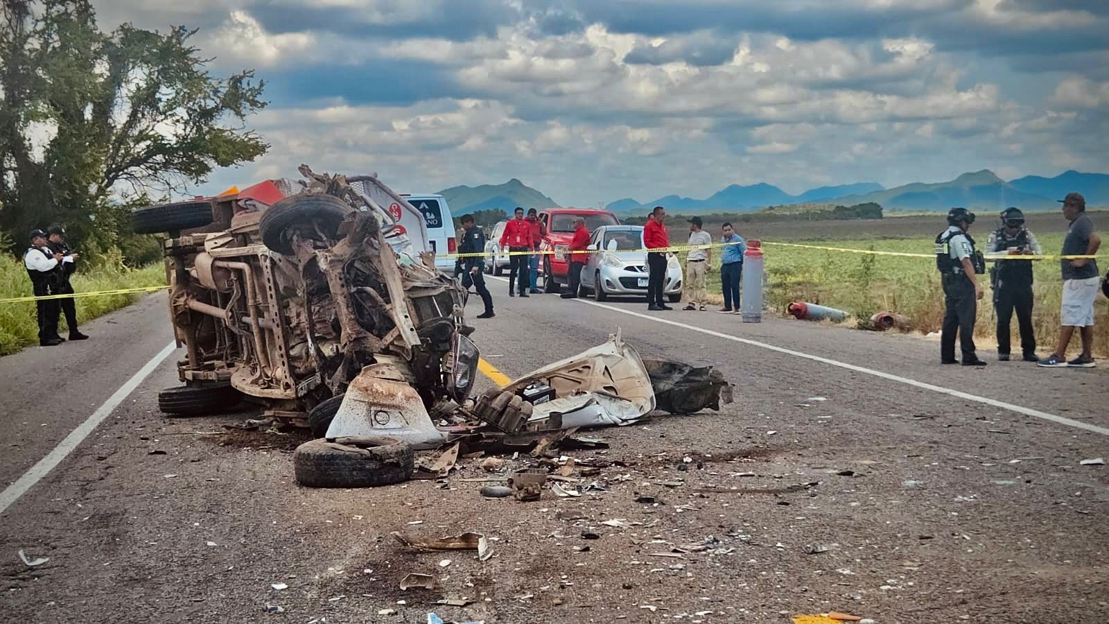 Tras el choque, la camioneta de gas quedó volcada sobre uno de sus costados y varios cilindros salieron disparados, cayendo sobre el pavimento y en terrenos de cultivo cercanos. El área fue acordonada por elementos de seguridad para evitar riesgos mayores, mientras personal de emergencia trabajaba en el retiro de los cilindros y el rescate de los lesionados.