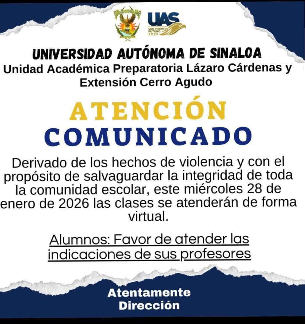 Mocorito, Sin.- La Unidad Académica Preparatoria Lázaro Cárdenas y su Extensión Cerro Agudo, de la Universidad Autónoma de Sinaloa (UAS), determinó que este miércoles 28 de enero de 2026 las clases se desarrollen de manera virtual, como medida preventiva ante los recientes hechos de violencia registrados en Mocorito.