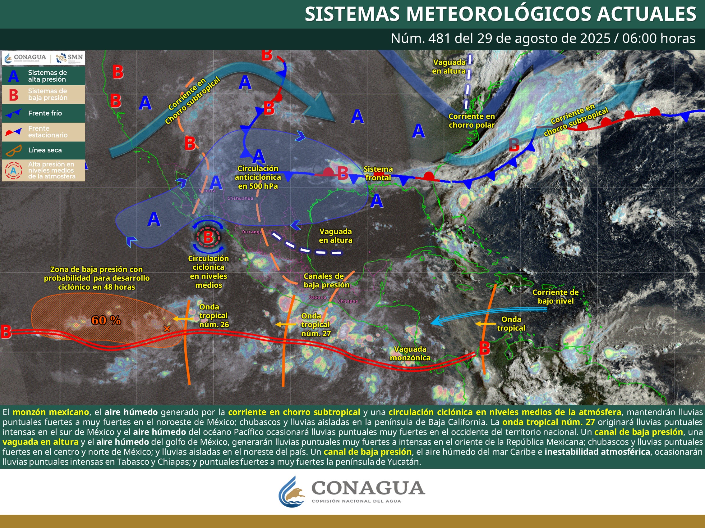 El monzón mexicano, el aire húmedo generado por la corriente en chorro subtropical, y una circulación ciclónica en niveles medios de la atmósfera, mantendrán lluvias puntuales fuertes a muy fuertes en noroeste de México; chubascos en Baja California Sur; y lluvias aisladas en zonas de Baja California.