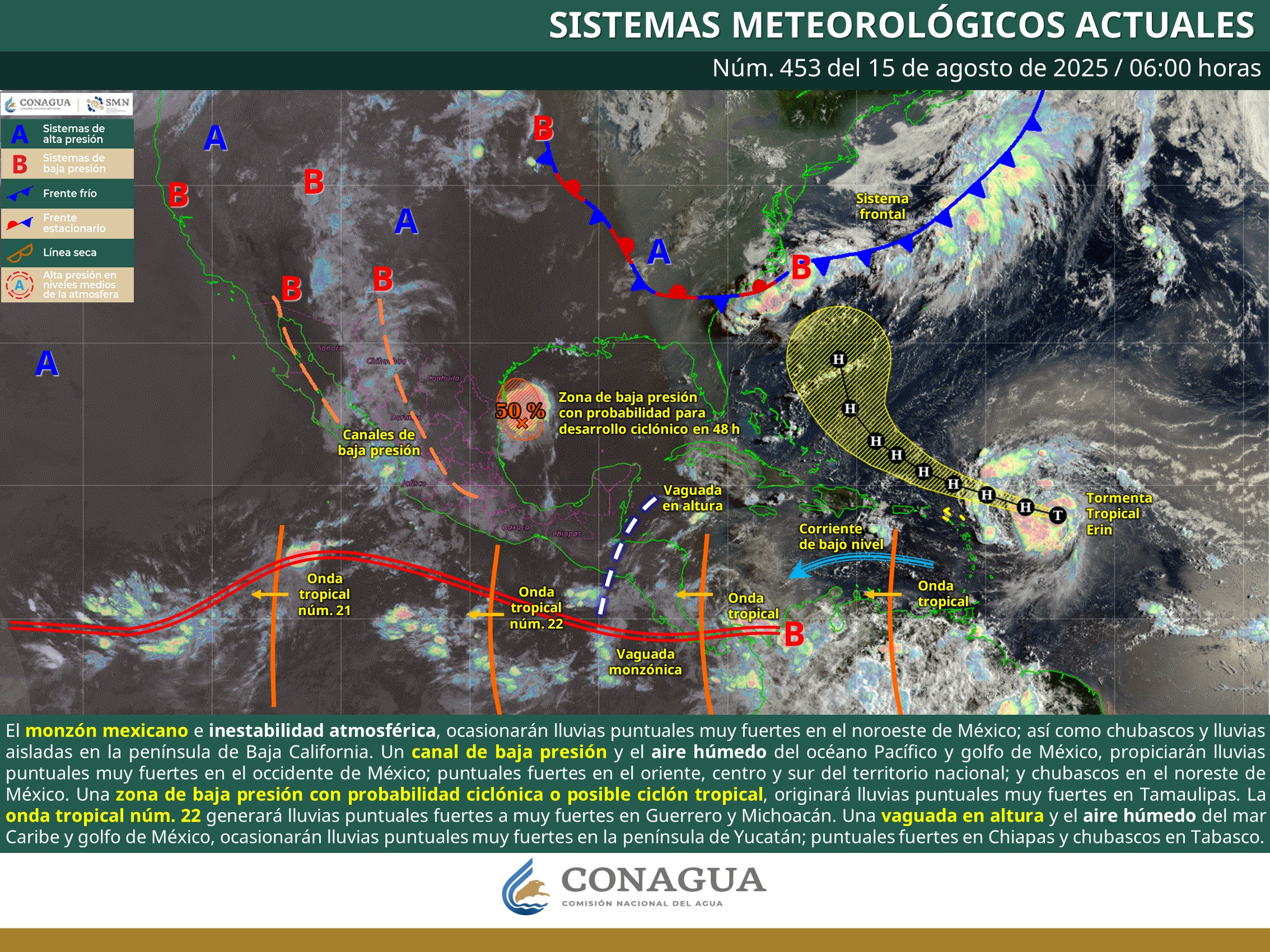 La onda tropical núm. 22 generará lluvias puntuales fuertes en Guerrero y puntuales muy fuertes en Michoacán. Asimismo, una vaguada en altura que se desplazará sobre la península de Yucatán y el sureste mexicano, en combinación con el ingreso de aire húmedo del mar Caribe y golfo de México, ocasionará lluvias puntuales muy fuertes en Quintana Roo, Yucatán y Campeche; puntuales fuertes en Chiapas; e intervalos de chubascos en Tabasco.