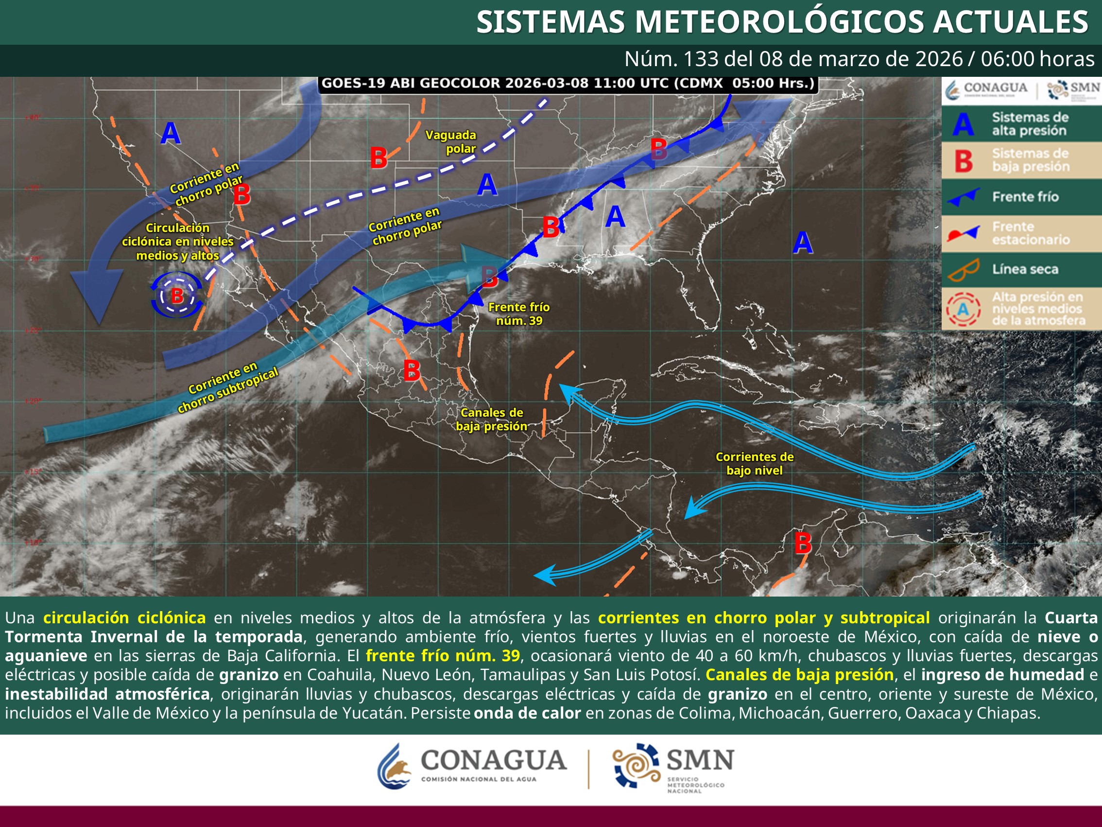 Una circulación ciclónica en niveles medios y altos de la atmósfera sobre la península de Baja California y las corrientes en chorro polar y subtropical darán origen a la Cuarta Tormenta Invernal de la temporada, que en combinación con el nuevo frente frío (núm. 40), generarán ambiente frío, vientos fuertes y lluvias en el noroeste mexicano, con probable caída de nieve o aguanieve en las sierras de San Pedro Mártir y La Rumorosa, B.C.