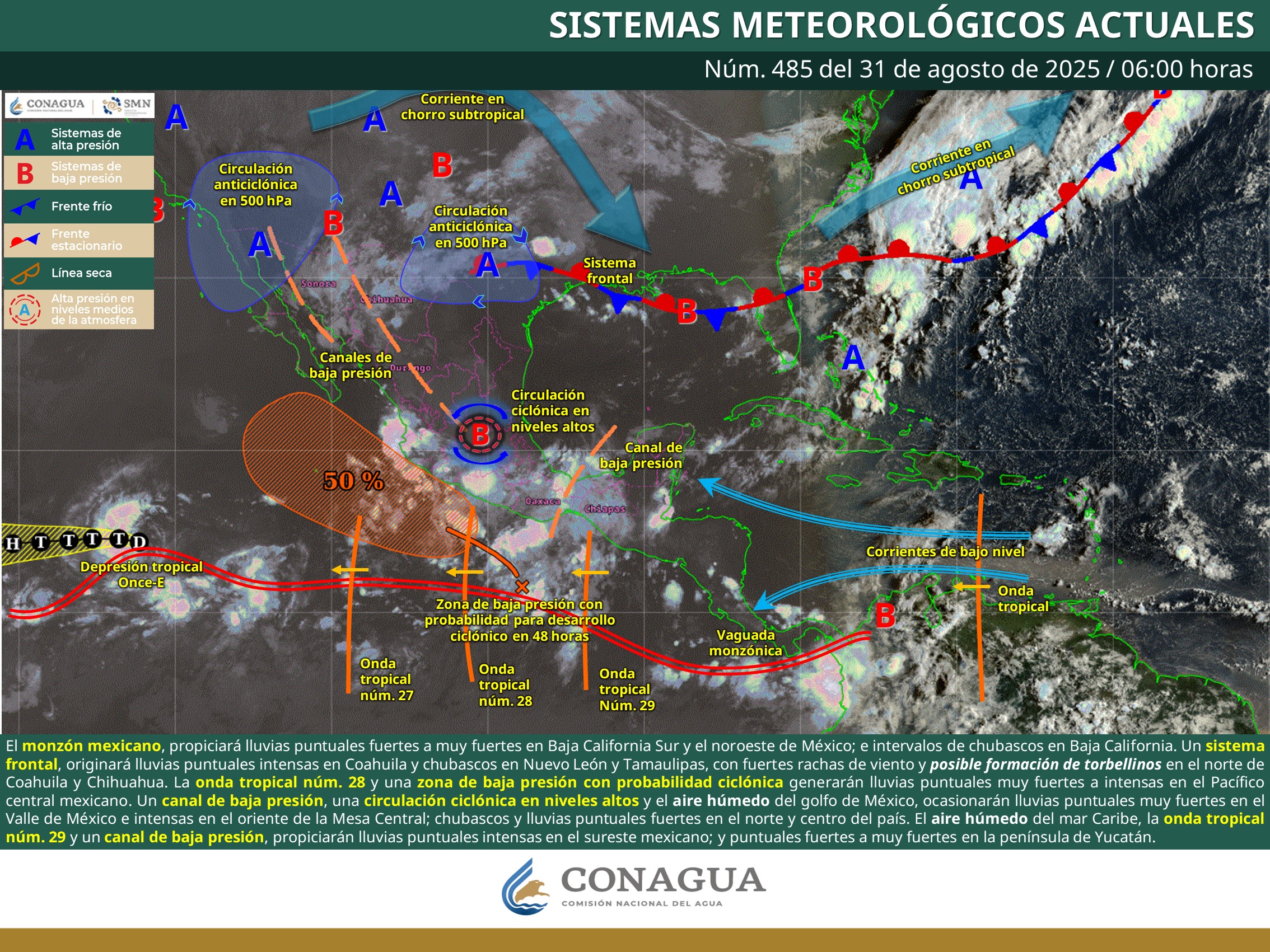La entrada de aire húmedo del mar Caribe en la península de Yucatán y la onda tropical núm. 29 que se desplazará sobre el sureste mexicano, en interacción con un canal de baja presión, propiciarán lluvias puntuales intensas en Chiapas, Tabasco y Oaxaca; puntuales muy fuertes en Yucatán y Campeche; y puntuales fuertes en Quintana Roo. Finalmente, prevalecerá el ambiente caluroso por la tarde sobre entidades del norte y centro de la República Mexicana, estados del litoral del Pacífico y del golfo de México, además de la península de Yucatán, y muy caluroso en zonas de Baja California Sur, norte de Sinaloa, noreste de Chihuahua, este de Nuevo León y oeste de Tamaulipas, llegando a ser extremadamente caluroso con temperaturas superiores a 45 °C en el noreste de Baja California y noroeste de Sonora. Asimismo, finalizará la onda de calor en Tamaulipas, Nuevo León y Oaxaca.