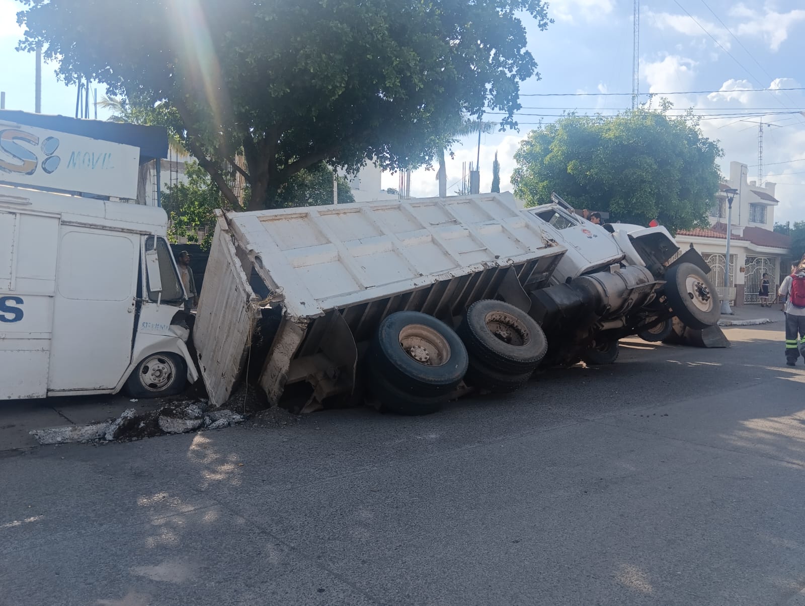Guasave, Sin.– La tarde de este martes se registró un socavón en la calle Juan Carrasco, en la colonia Centro, casi esquina con Blas Valenzuela, provocando el hundimiento de un camión de carga y daños a dos vehículos particulares que se encontraban en las inmediaciones.