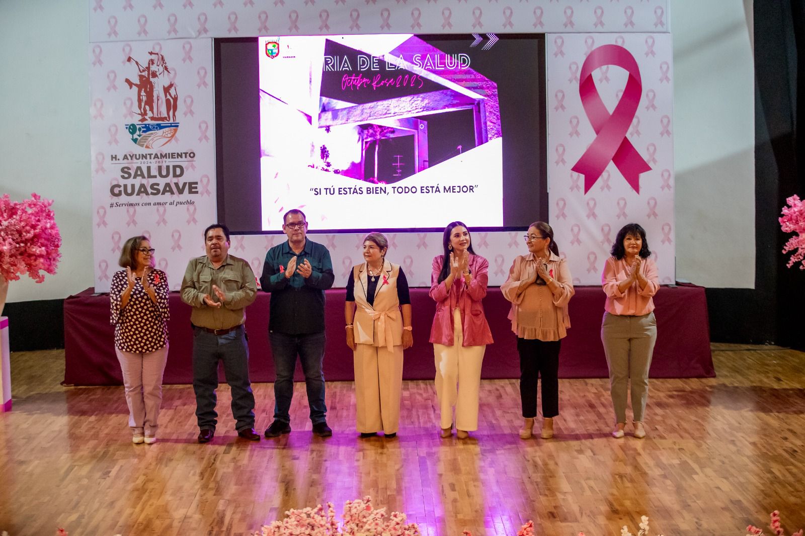 Guasave, Sin.- La prevención salva vidas, por lo que hoy se sumaron el Ayuntamiento de Guasave, el sector salud, escuelas y laboratorios privados en la Feria de la Salud “Mes Rosa”, que realizó la Dirección General de Salud, en el marco del mes de la lucha contra el cáncer de mama, jornada en la que también formaron un lazo rosa monumental, en la explanada del Auditorio Héroes de Sinaloa.