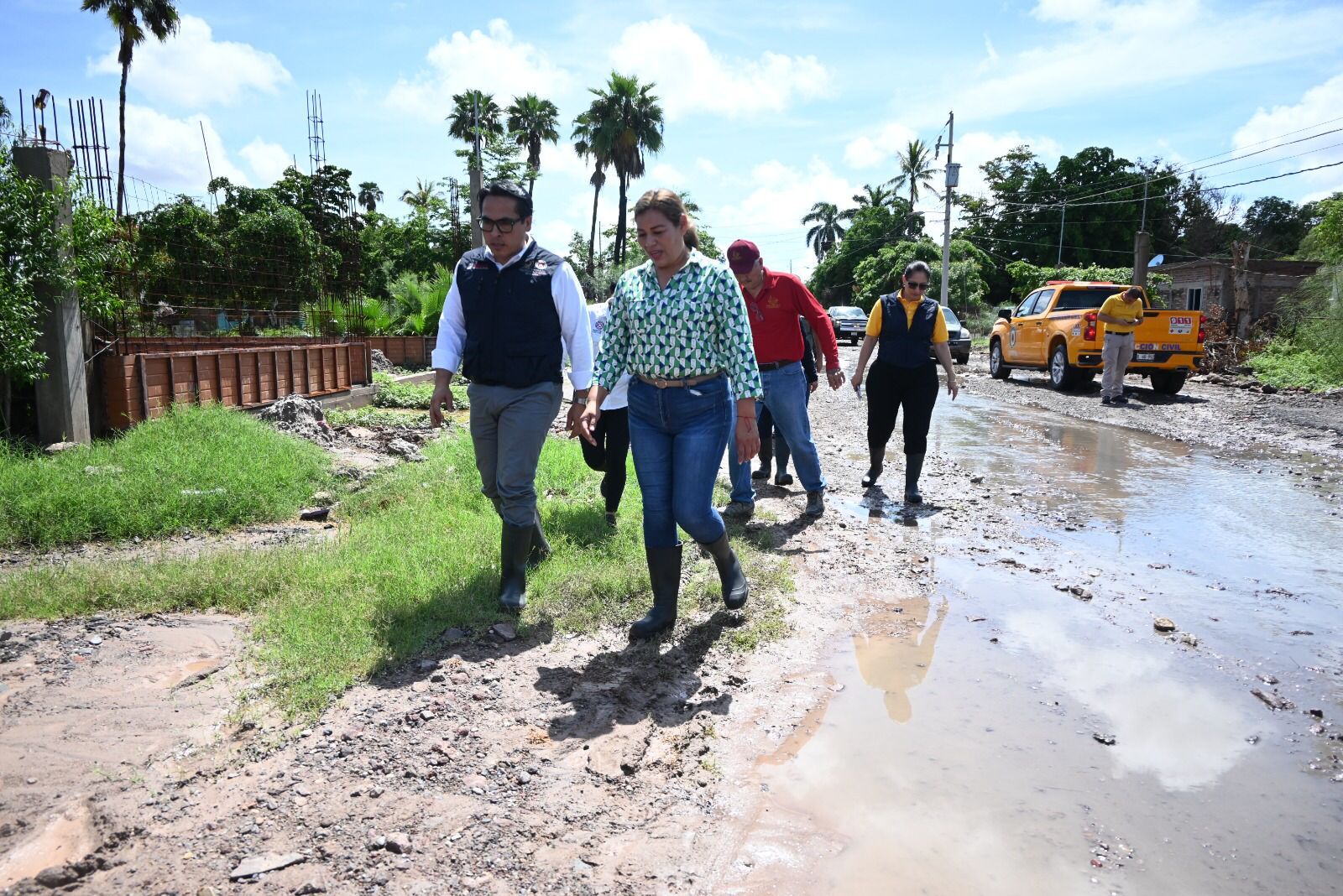 La presidenta municipal Llanes Carreón continuó atendiendo al llamado de los ciudadanos, recorriendo las zonas más afectadas de la cabecera municipal, donde se unió Protección Civil Estatal, acompañado del director Aurelio Roy Navarrete, a fin de reforzar la atención a las familias afectadas.