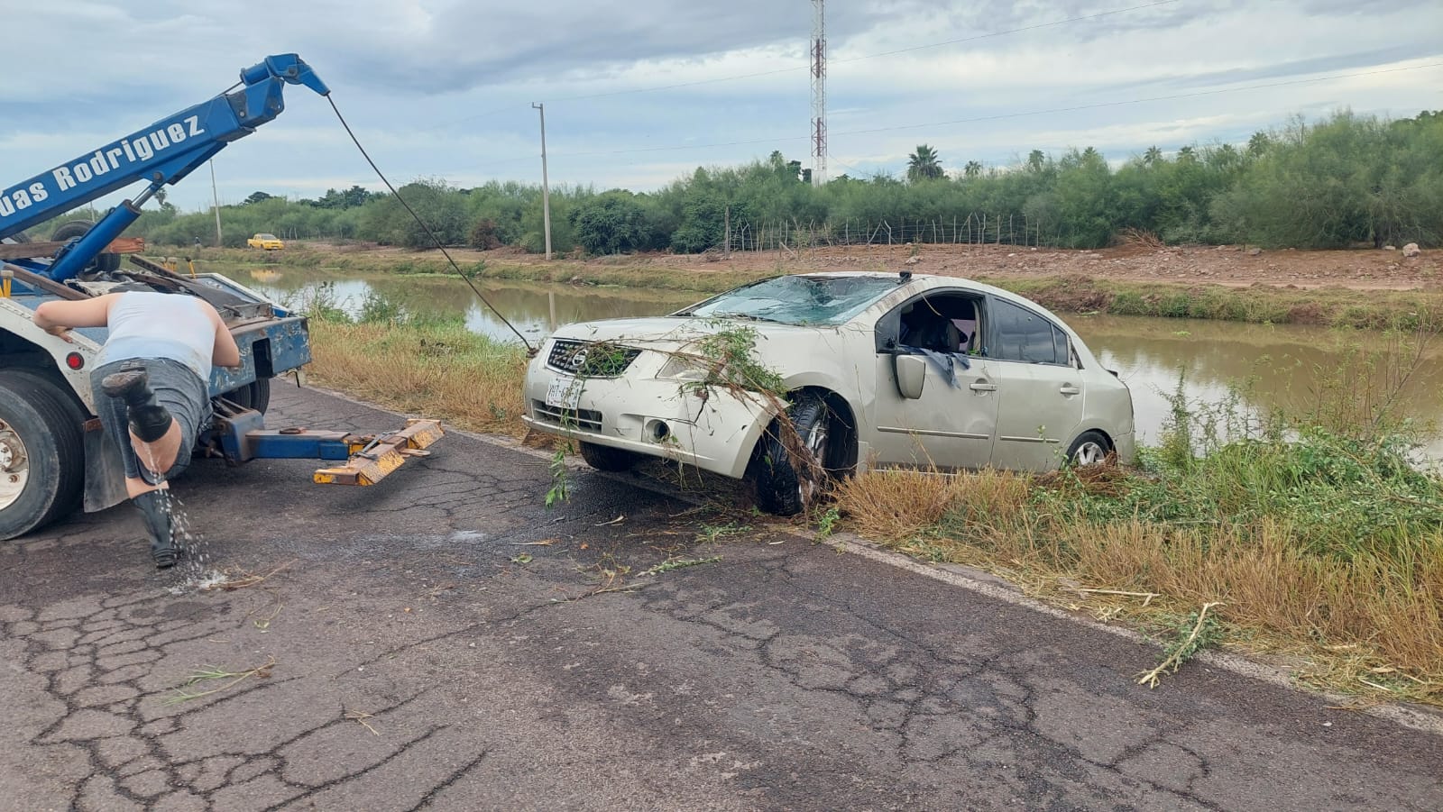 Paramédicos de la Cruz Roja acudieron al lugar para brindar atención médica a la afectada, quien no presentó lesiones de gravedad y no requirió traslado hospitalario. El vehículo involucrado fue identificado como un Nissan Sentra color arena, el cual quedó parcialmente sumergido en la obra hidráulica.