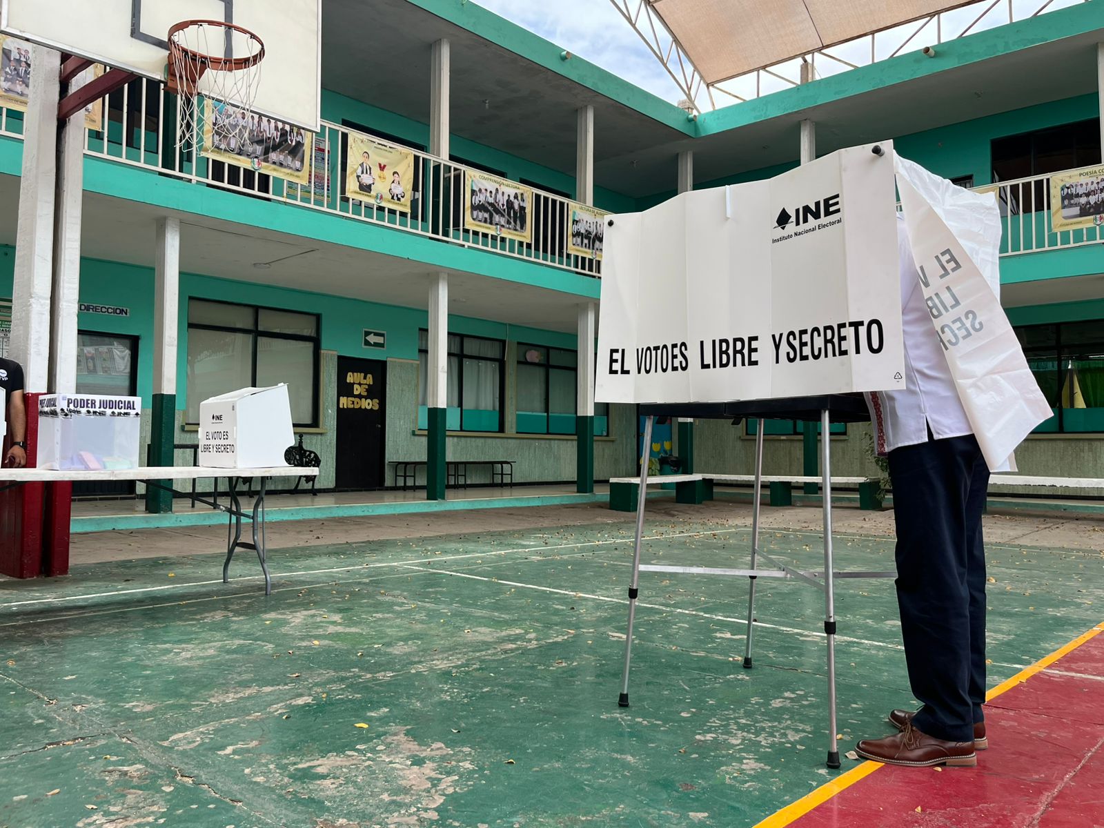 El presidente municipal arribó a las 10:20 a.m. con un nublado cielo y fuerte viento, para elegir a sus preferidos candidatos a jueces, magistrados y ministros. La casilla se encontraba desolada, sin personas emitiendo su voto desde aproximadamente 20 minutos atrás.