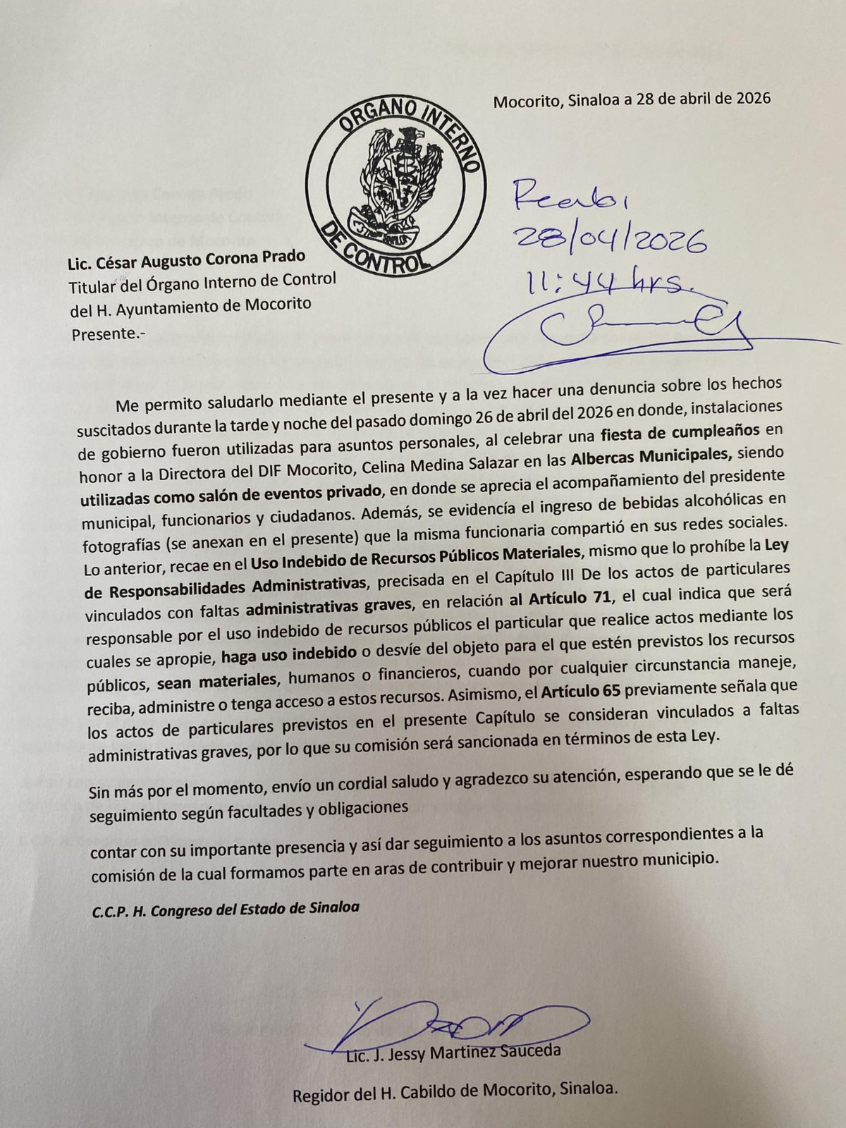 Mocorito, Sin.- El regidor Jessy Martínez Sauceda elevó el tono y presentó una denuncia formal ante el Órgano Interno de Control (OIC) por la presunta realización de una fiesta privada en las albercas municipales de Mocorito, un hecho que calificó como una “falta administrativa grave” y un claro abuso de recursos públicos.