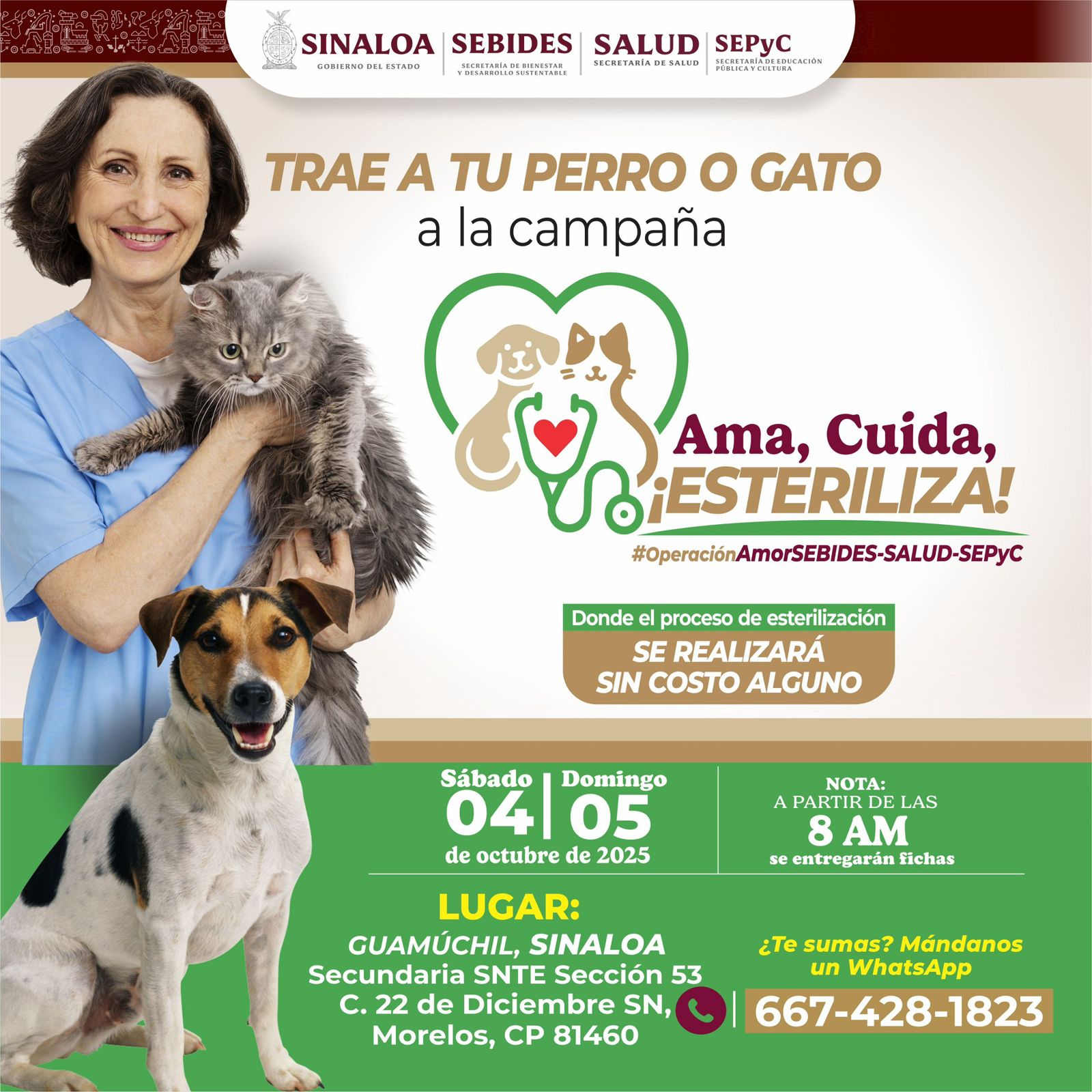 Guamúchil, Sin.- El titular del Centro de Salud y Bienestar Animal (CESyBA), Jesús Alfredo Díaz Mejía, informó que, el próximo domingo 05 de octubre será el último día para aprovechar el programa de esterilización animal gratuito que promueve el gobierno del estado en la ciudad de Guamúchil, el cual lleva por nombre “Ama, Cuida, ¡Esteriliza!”.