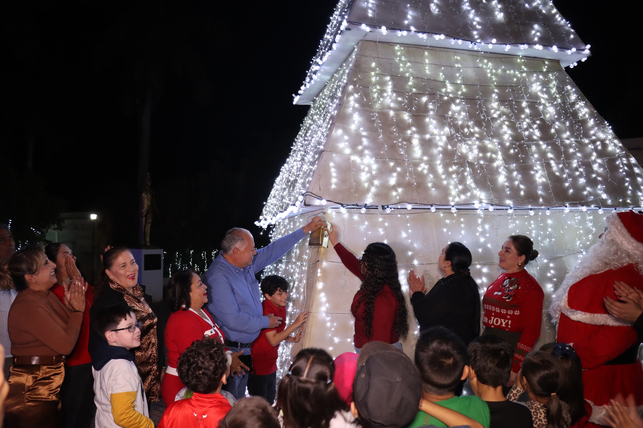 Sinaloa de Leyva, Sin.- El espíritu navideño se apoderó del municipio de Sinaloa durante el tradicional encendido del árbol navideño, un evento que tuvo lugar en la Explanada Cívica de Sinaloa de Leyva y fue presidido por el alcalde Rolando Mercado, acompañado por sus hijos, Samantha y Missael Mercado de la O.