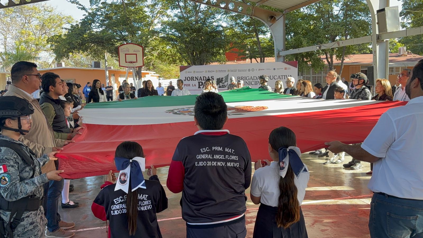 Los Mochis, Sin.- Dentro del marco del Día de la Bandera, que está constituido el día 24 de febrero, el ayuntamiento de Ahome conmemoró esta fecha en las instalaciones de la escuela primaria Ángel Flores ubicada en el Ejido 20 de Noviembre, esto con la intención de fortalecer los valores cívicos entre la niñez.