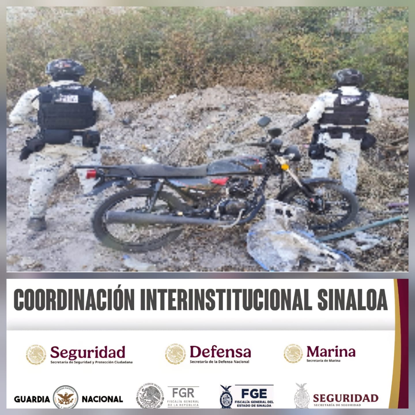 Culiacán, Sin.- Elementos de la Guardia Nacional, en coordinación con el Ejército Mexicano, la Secretaría de Marina, la Secretaría de Seguridad y Protección Ciudadana, la Fiscalía General de la República y la Fiscalía General del Estado, localizaron y aseguraron una motocicleta y una camioneta, ambos con reporte de robo.