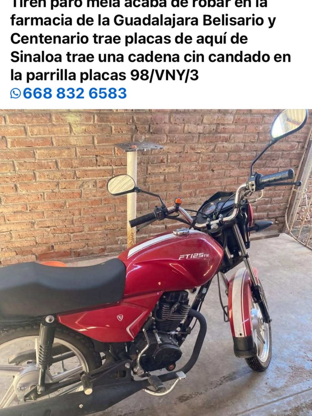 La motocicleta robada es de la marca Italika cilindrada 125, color cereza y placas 98-VNY-3. Al momento solamente se ha realizado la denuncia pública del hecho en redes sociales, pero también se presentará formalmente ante la Vicefiscalía Regional Zona Norte, de acuerdo a lo que compartió finalmente la víctima.