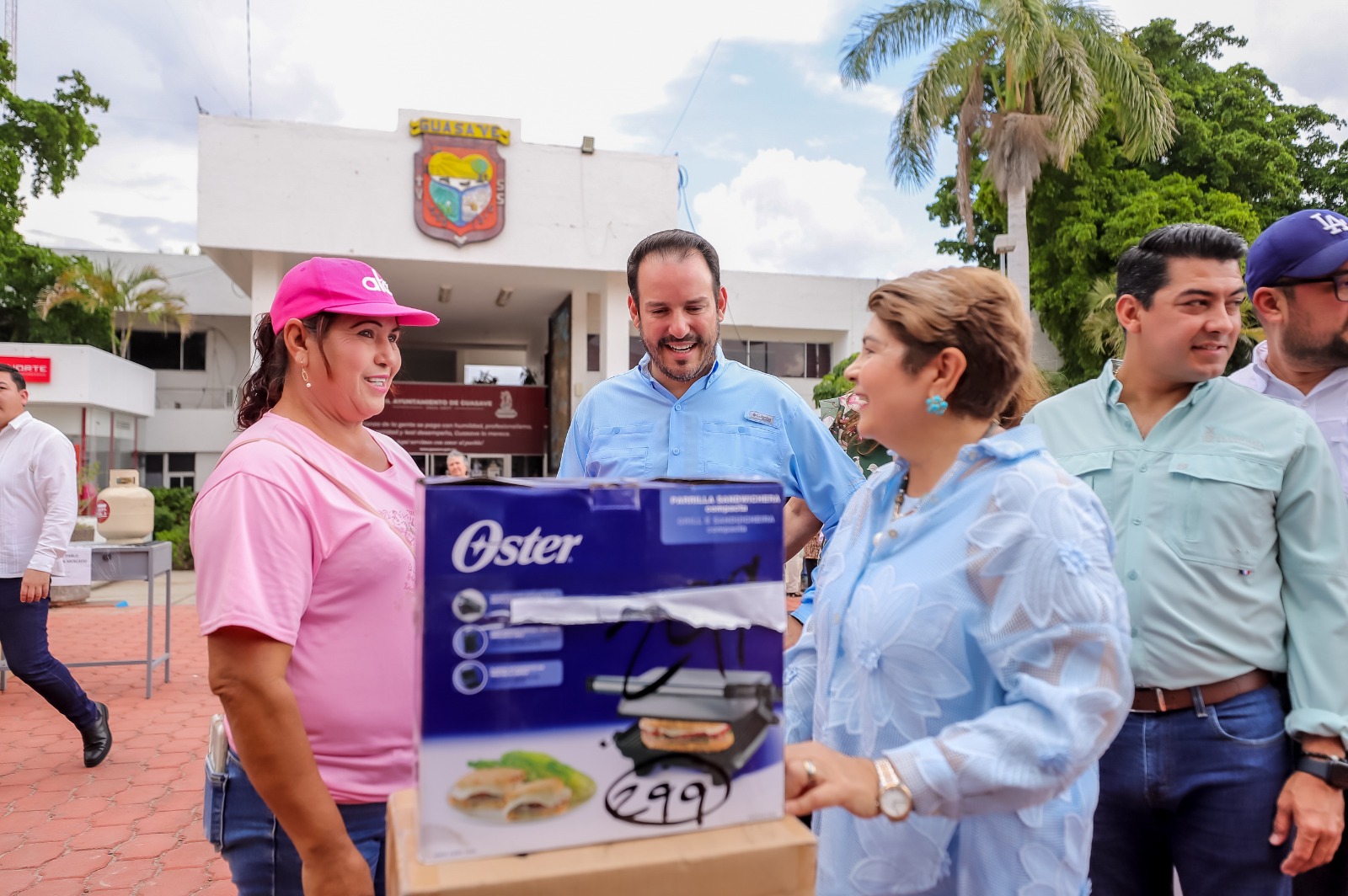 Guasave, Sin.- La presidenta municipal Cecilia Ramírez Montoya y el secretario de Economía, Ricardo Velarde Cárdenas, encabezaron la entrega de 231 equipos a 31 micros, pequeñas y medianas empresas de Guasave, de 31 comunidades, a través de los programas Equipa Sinaloa y Estiliza, además de la capacitación del programa Saber Hacer.