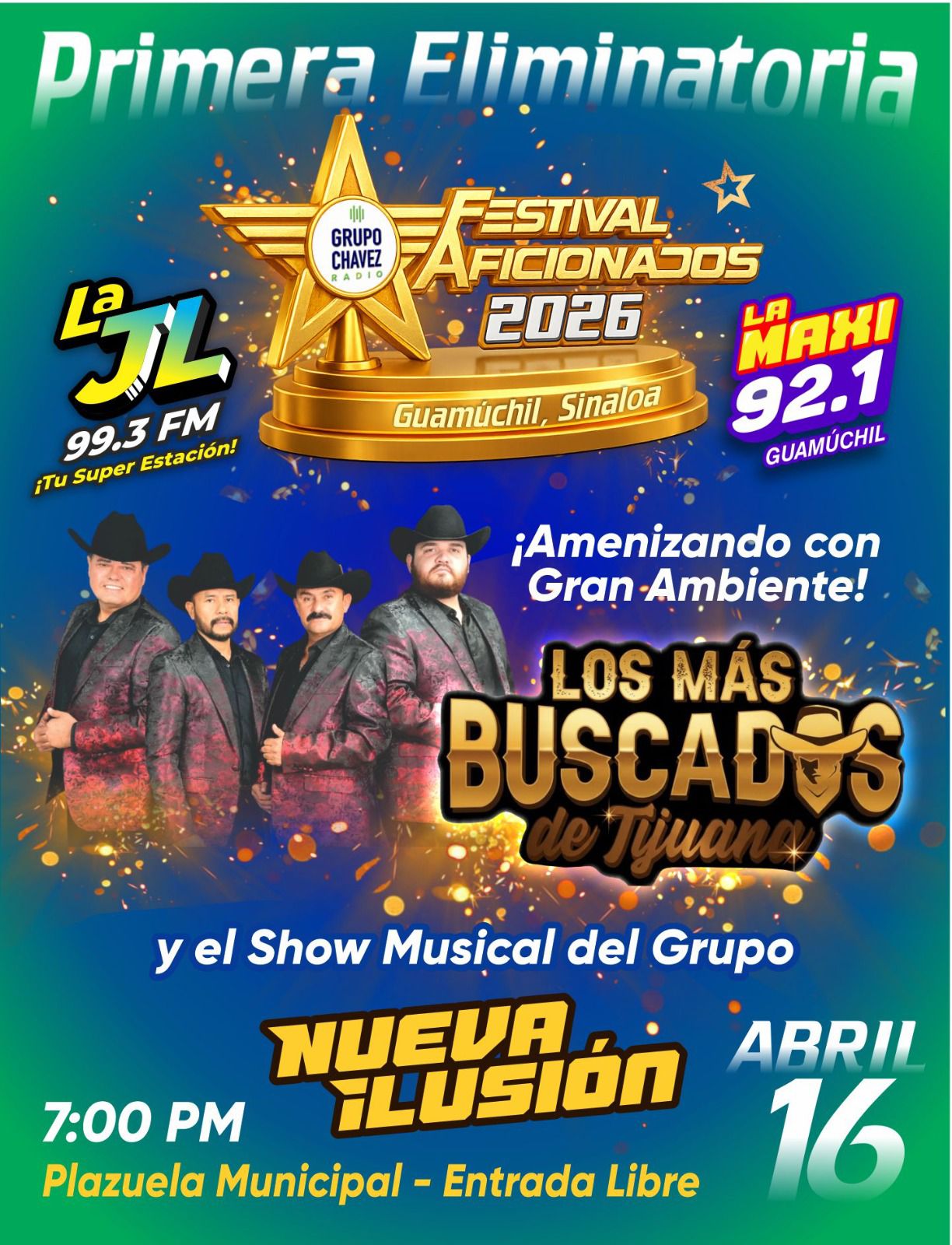 Guamúchil, Sin.- Este jueves 16 de abril arranca la primera eliminatoria del Festival de Aficionados 2026 que organiza el Grupo Chávez Radio, la cual se llevará a cabo en la plazuela Municipal Pedro Infante, en la ciudad de Guamúchil a partir de las 7:00 p.m., informó Maribel Angulo López.