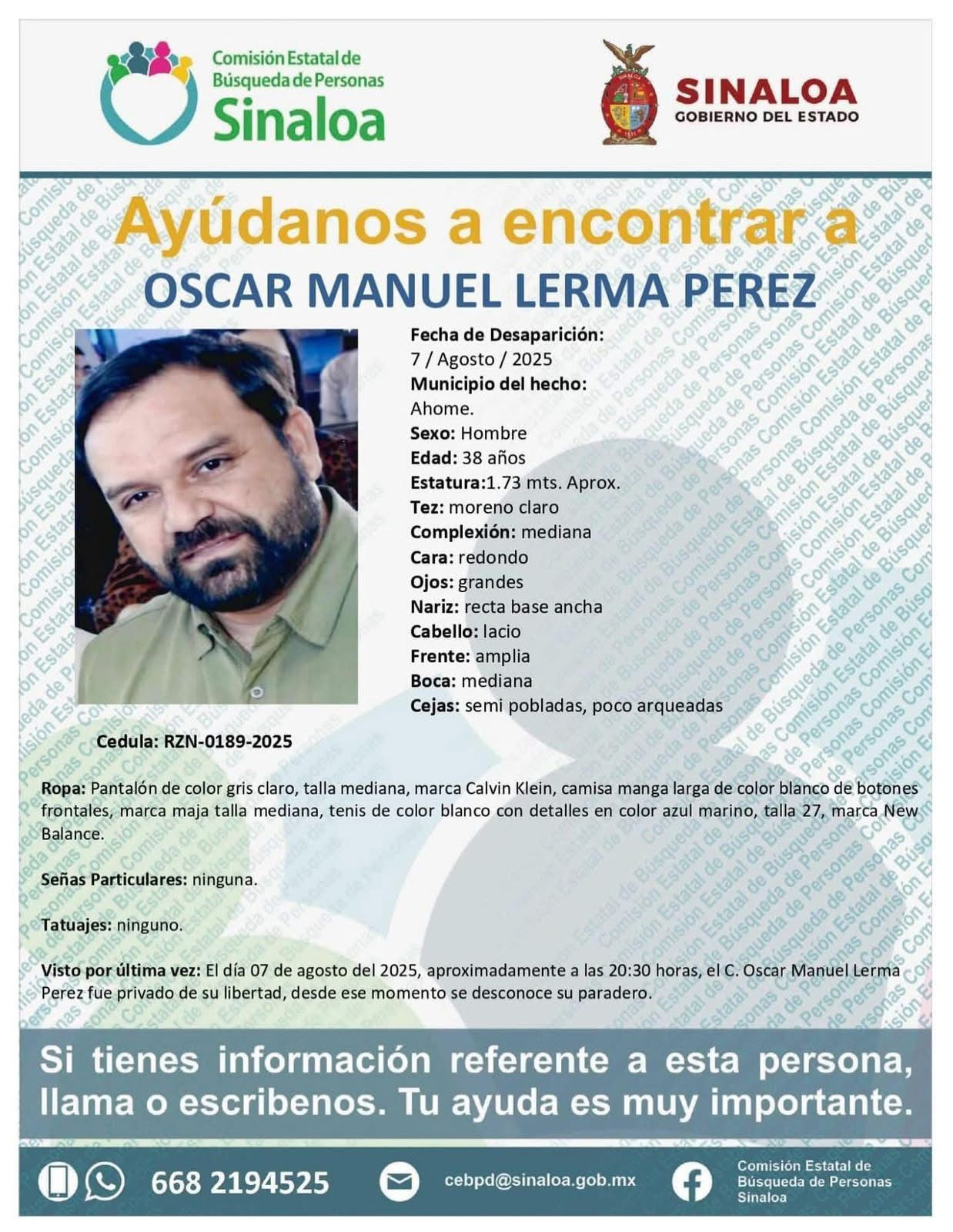 Óscar Lerma, de 28 años de edad, fue privado de la libertad el pasado 07 agosto aproximadamente a las 8:30 p.m. En ese momento vestía pantalón color gris, camisa manga larga color blanco marca Maja y tenis color blanco con detalles en azul marino.
