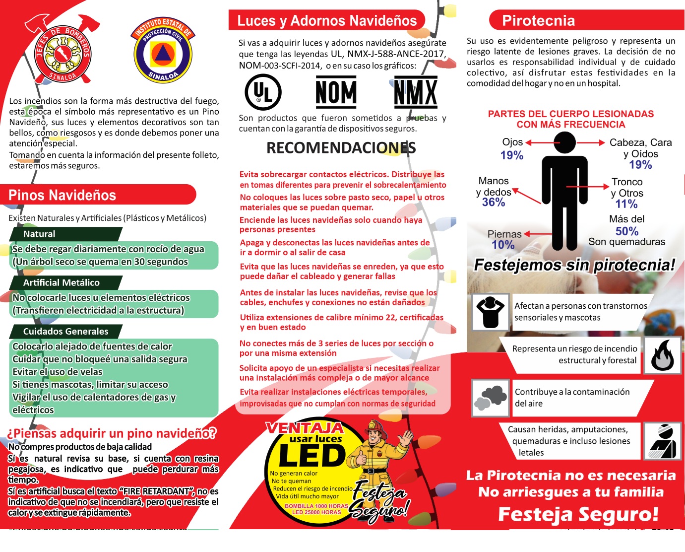 Horacio López Valenzuela, comandante del Heroico Cuerpo de Bomberos en Guamúchil, detalló que, que esta actividad forma parte de una estrategia estatal a la que se suma bomberos, donde entregan un tríptico a la ciudadanía, que explica cuidados tener al colocar pinos navideños naturales o artificiales, la colocación de luces navideñas y los riesgos del uso de la pirotecnia.