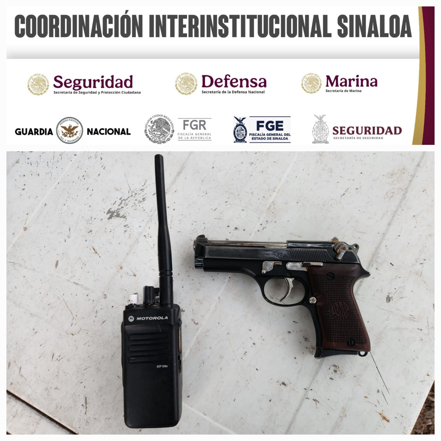 Culiacán, Sin.- Elementos de la Secretaría de Seguridad Pública de Sinaloa, a través del Grupo de Operaciones Especiales Sinaloa (GOES) de la Policía Estatal Preventiva, en coordinación con el Ejército Mexicano, la Guardia Nacional, la Secretaría de Marina, la Secretaría de Seguridad y Protección Ciudadana, la Fiscalía General de la República y la Fiscalía General del Estado, aseguraron a un civil en poder de un arma abastecida y un radio en el municipio de Culiacán.