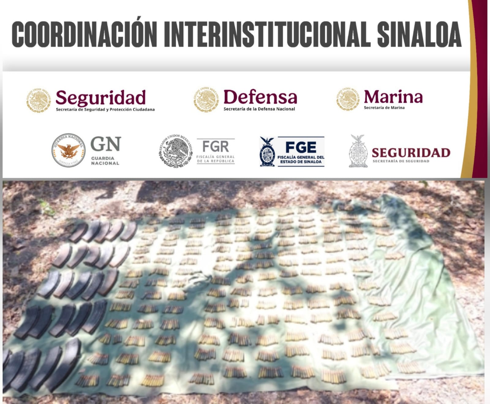 Culiacán, Sin.- Elementos del Ejército Mexicano, en coordinación con la Guardia Nacional, la Secretaría de Marina, la Secretaría de Seguridad y Protección Ciudadana, la Fiscalía General de la República, la Fiscalía General del Estado y la Secretaría de Seguridad Pública del Estado, localizaron cargadores y más de mil cartuchos en el municipio de Escuinapa.