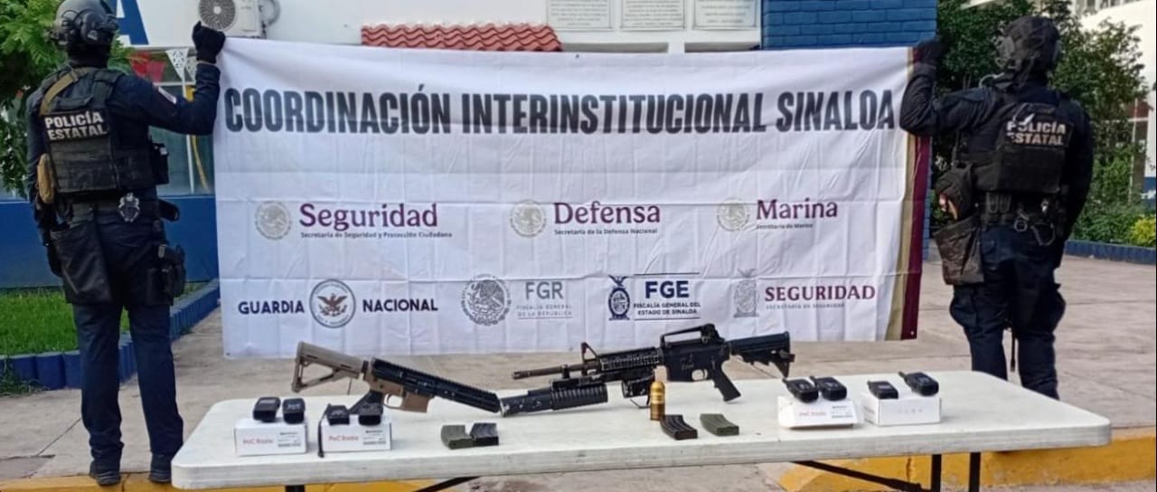 Culiacán, Sin.- Elementos de la Secretaría de Seguridad Pública Estatal, a través del Grupo de Operaciones Especiales de Sinaloa (GOES), en coordinación con el Ejército Mexicano, la Guardia Nacional, la Secretaría de Marina, la Secretaría de Seguridad y Protección Ciudadana, la Fiscalía General de la República y la Fiscalía General del Estado, aseguraron en Villa Juárez, del municipio de Navolato, a un hombre y una mujer con fusiles, un lanzagranadas, una granada, cargadores abastecidos y radios de comunicación.