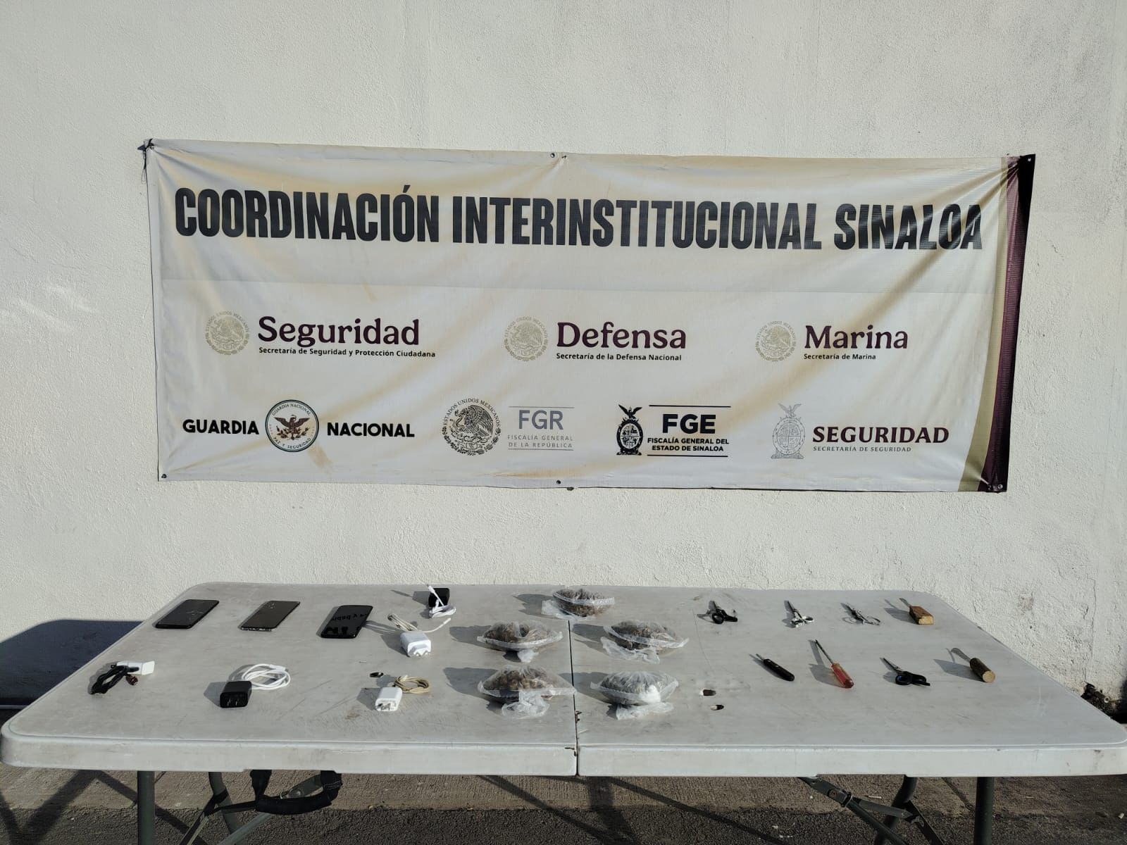 Culiacán, Sin.– Elementos de la Secretaría de Seguridad Pública de Sinaloa, a través del Grupo de Operaciones Especiales Sinaloa (GOES) de la Policía Estatal Preventiva, en coordinación con el Ejército Mexicano, la Guardia Nacional, la Secretaría de Marina, la Secretaría de Seguridad y Protección Ciudadana, la Fiscalía General de la República y la Fiscalía General del Estado, llevaron a cabo este sábado 27 de diciembre de 2025 la revisión de dos módulos del Centro Penitenciario Aguaruto, donde se aseguraron droga y otros objetos prohibidos.