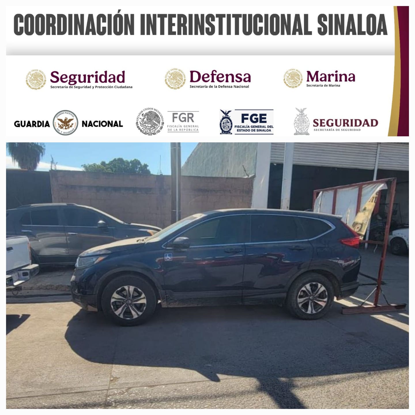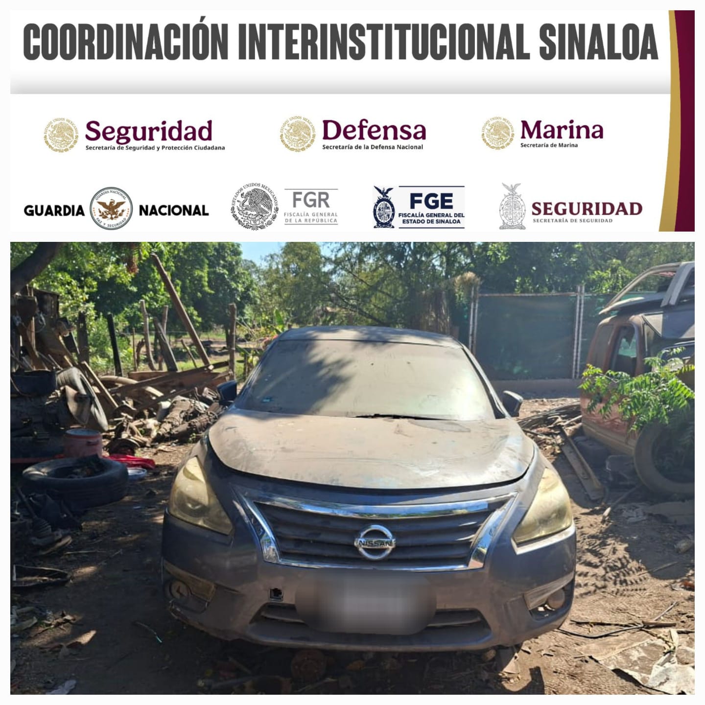 Durante un operativo en el municipio de Eldorado, realizado por elementos de la Fiscalía General del Estado de la Unidad de Robo de Vehículos y de la Unidad de Detenciones en Flagrancia, en coordinación con el Ejército Mexicano, la Guardia Nacional y la Secretaría de Marina, arribaron a las inmediaciones de un yonque ubicado en el poblado de la Cruz de Navito, donde localizaron un vehículo Nissan Altima con alteraciones en el número de serie, mismo que cuenta con reporte de robo. Al continuar con el despliegue en la cabecera municipal y al circular por la colonia Mariano Escobedo, las autoridades detectaron una camioneta CR-V marca Honda, la cual se informó que cuenta con un reporte de robo en el año en curso.